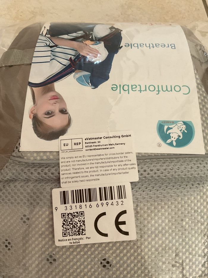 Porte bébé de hanche. De 3 mois à 6 mois. Max 20 kilos. État neuf jamais utilisé. Couleur gris. Marque GABESEY