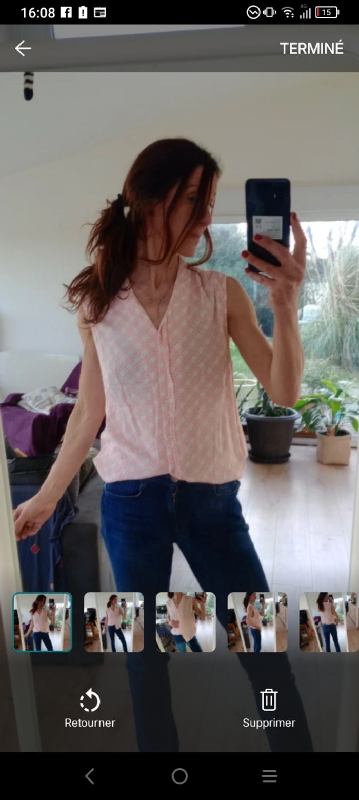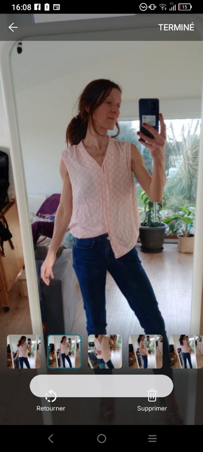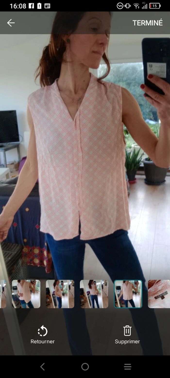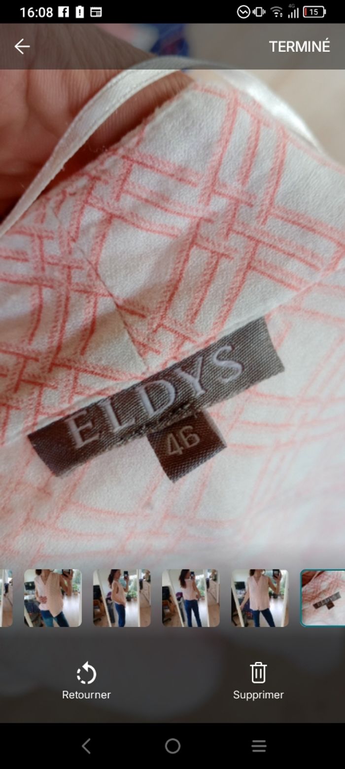 Joli chemisier sans manches sans col de la marque Eldys, idéal pour une tenue légère et estivale. Il présente un motif géométrique quadrillé dans les tons rose et blanc. ​Coupe : Fluide, sans manches, avec une encolure en V ​Détails : Boutonnage discret sur le devant avec rabat cache bouton Manque un bouton voir dernière photo.. on peut faire ça 😉 ​ ​Parfait pour porter avec un jean ou un pantalon blanc pour un look frais. Longueur 64 cm épaule 40 cm #calomomi_femme46 ​#eldys #chemisierfemme #taille46 #hautfemme #modefemme #chemisierrose #ete #tenueleger #femme46 #lookete