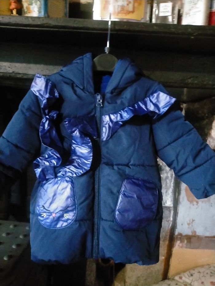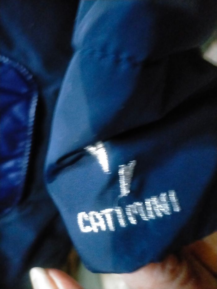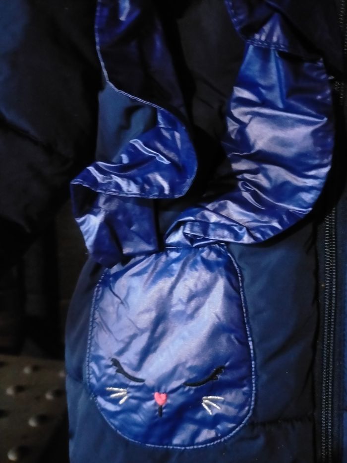 Excellent état. Manteau doudoune marine à capuche ouatiné et doublé de polaire bleu vif. Fermeture par zip, deux poches dont une avec broderie lapin d'où partent des volants. Broderie Catimini doré au bas d'une manche