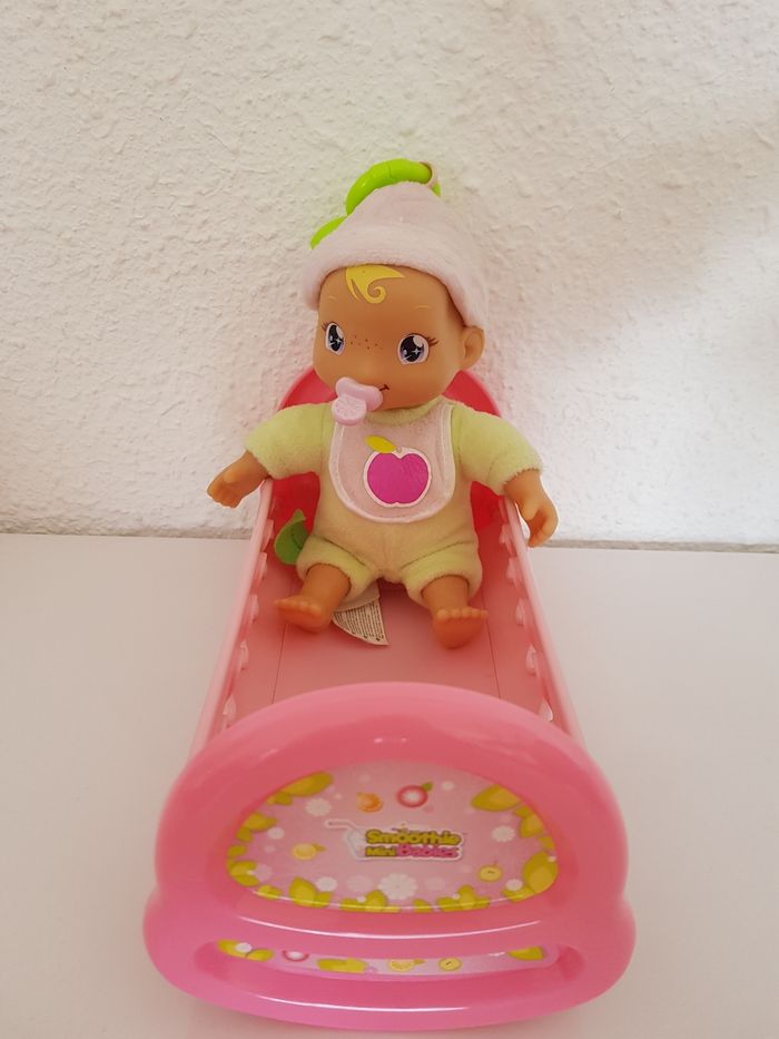 Poupon Babynou + petit lit Le lit fait 22,5 cm de longueur et 12/13 cm se largeur Le poupon est légèrement plus petit Très bon état
