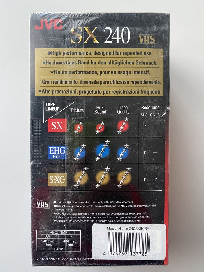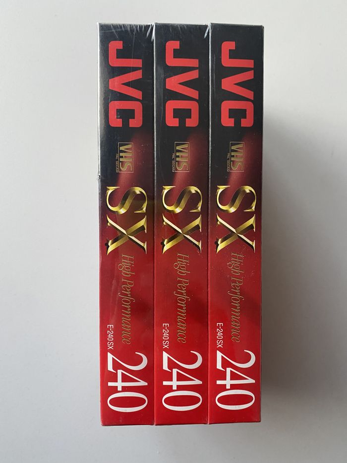 Pack de 3 cassettes vidéo VHS - JVC SX haute performance E-240. 4 heures d'autonomie pour chaque cassette. Cassettes pour un usage intensif. Emballage d'origine, neuves et scellées.