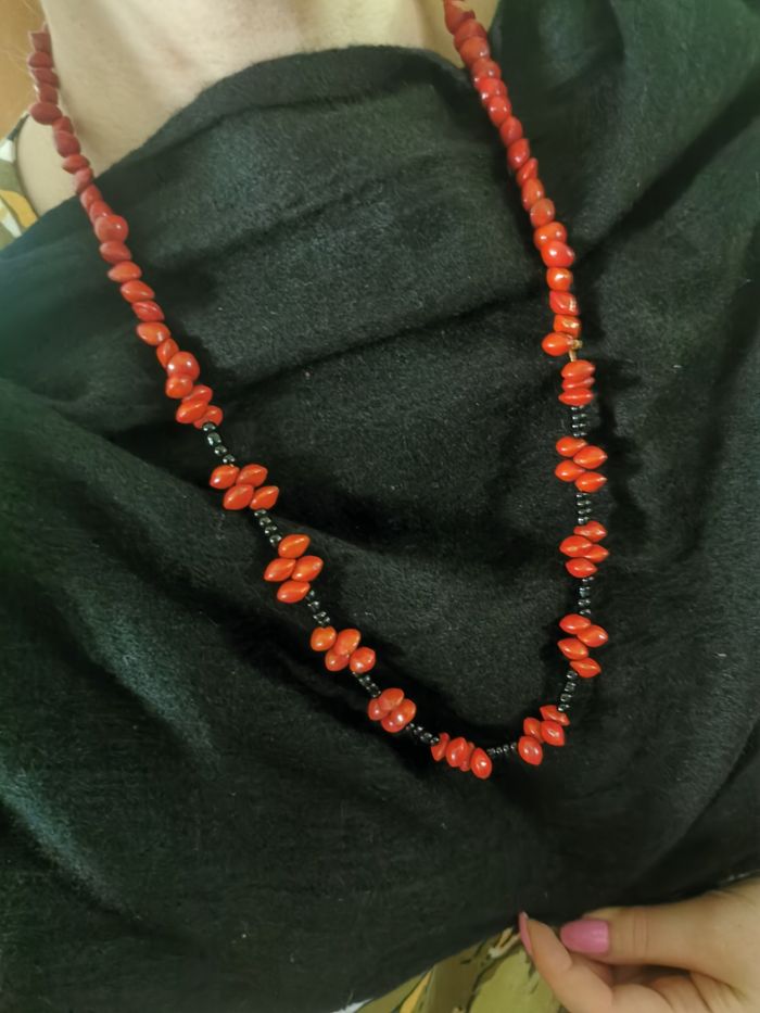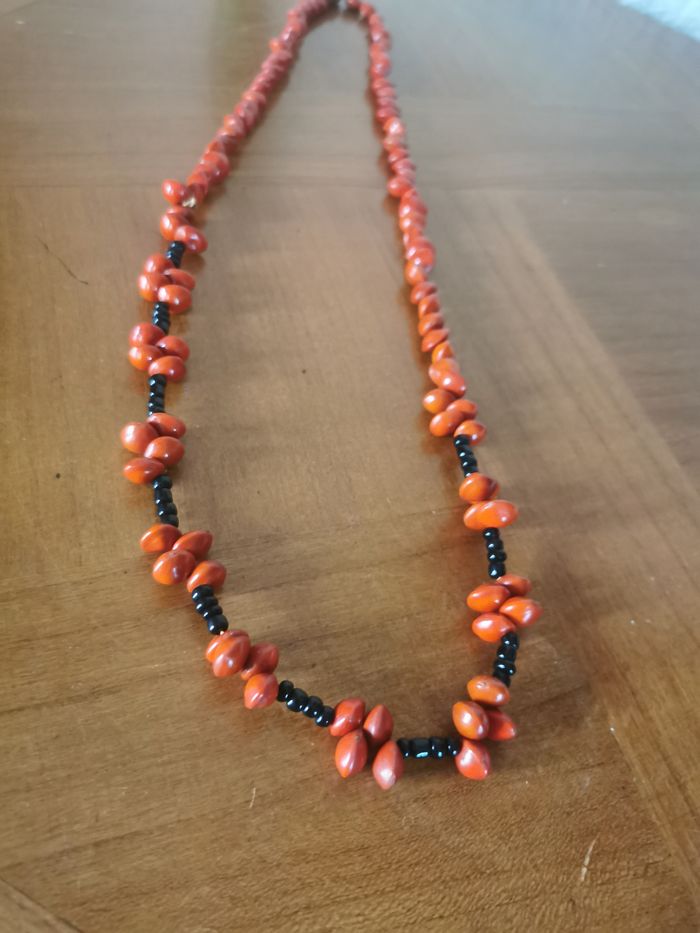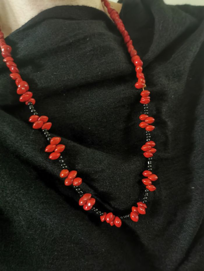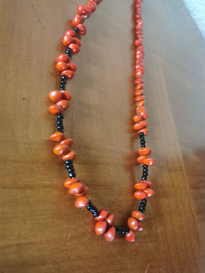 Sautoir en graines rouges porte-bonheur naturelles, adenanthera pavonina, bois de santal rouge et perles de rocaille noires. Collier sautoir vintage, enfilé sur le fil, en très bon état. Dimensions : Longueur (tour) : 70 cm Taille de perle : 8 mm Poids : 33g
