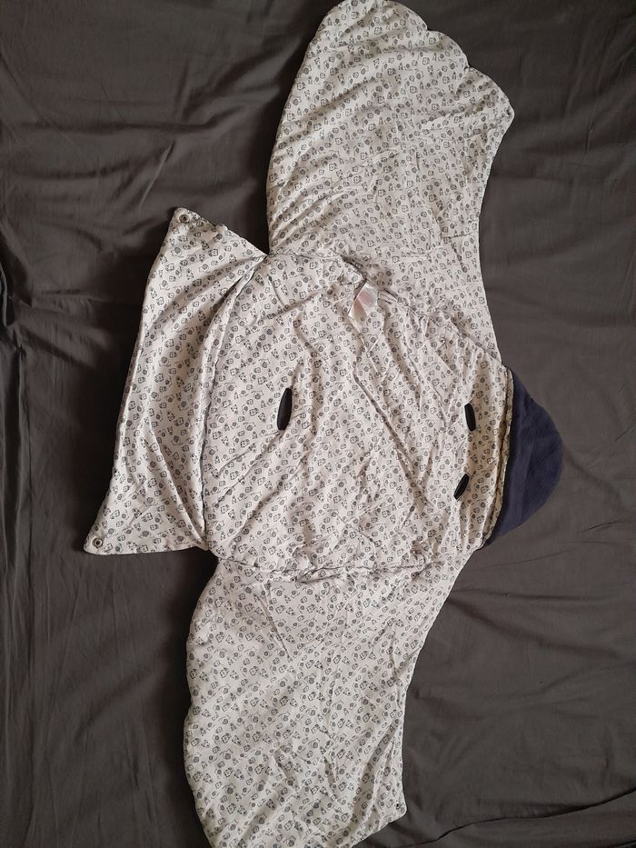Nid d'ange épais. Blanc avec motif à l'intérieur, bleu marine à l'extérieur. Avec 3 trous pour les ceintures du cosy notamment. Idéal dès la naissance