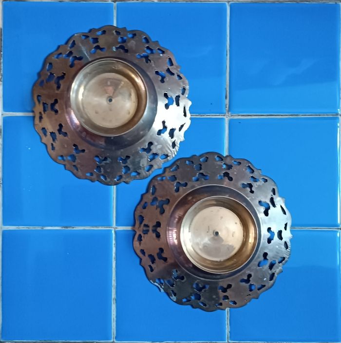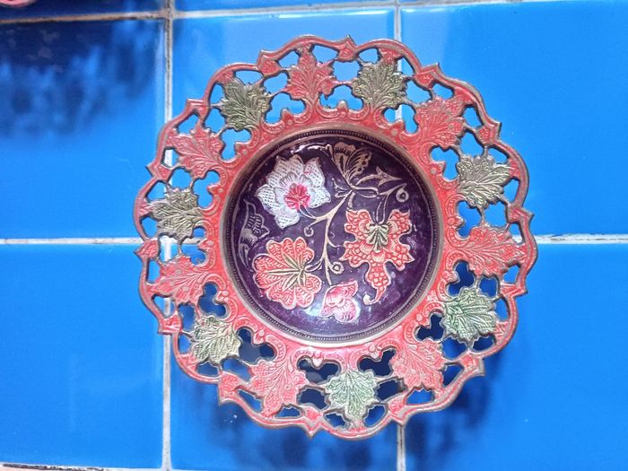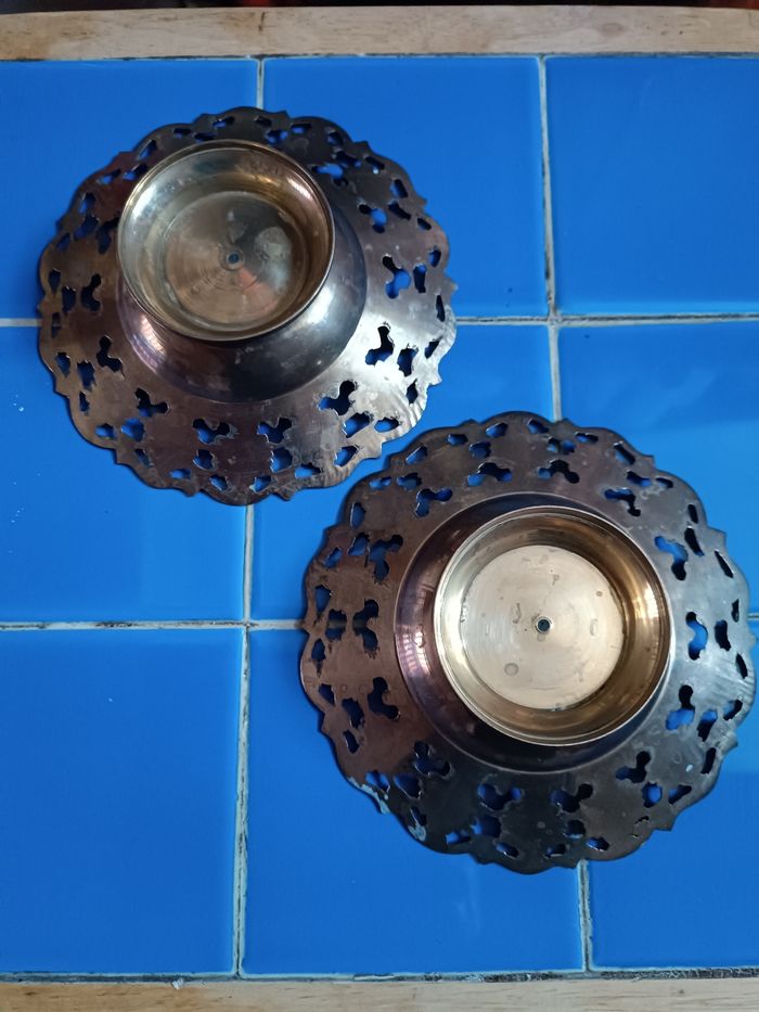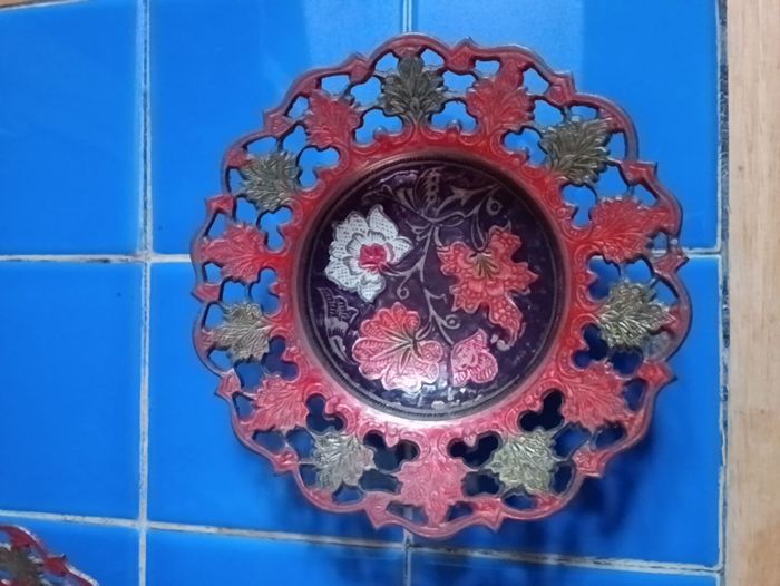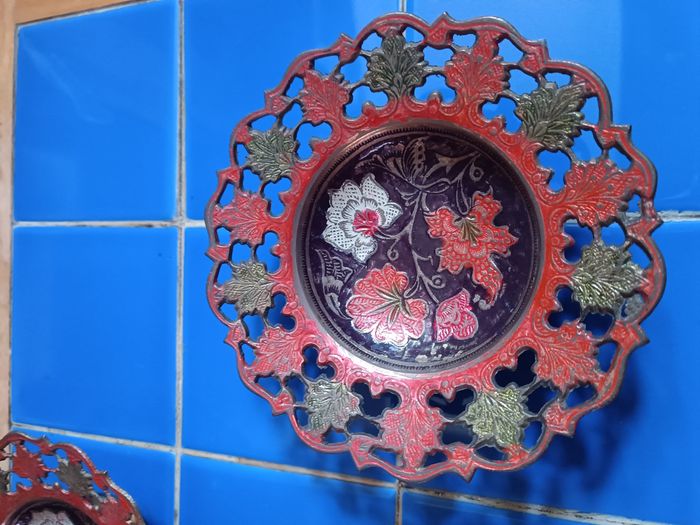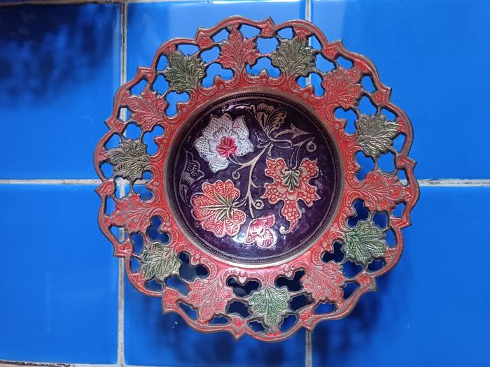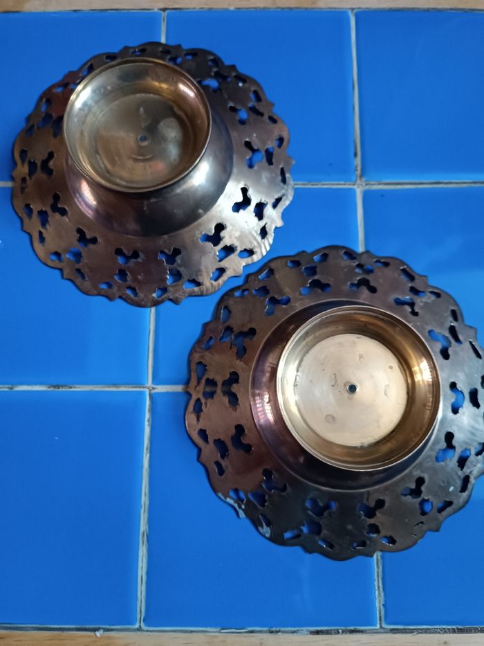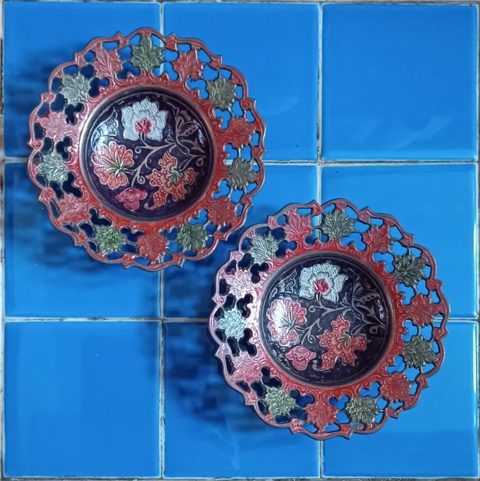 2 coupelles en cuivre émaillé décor floral diamètre 15 cm x 4 cm hauteur diamètre pied 7 cm très bon état cf photos