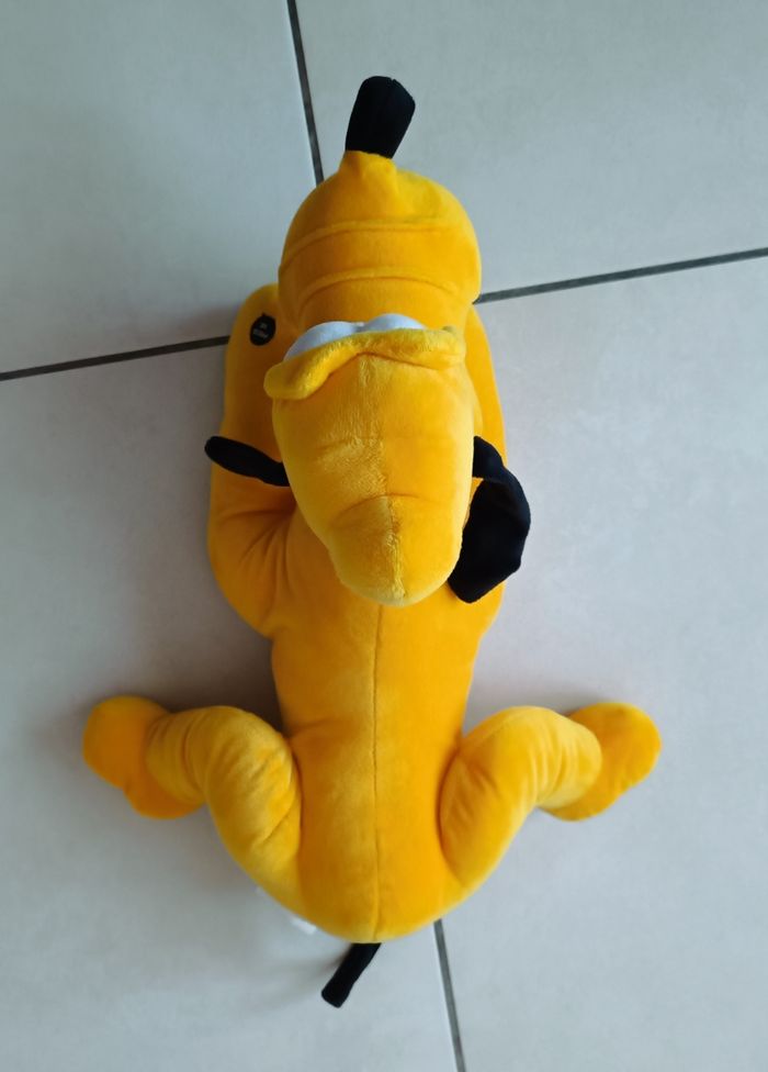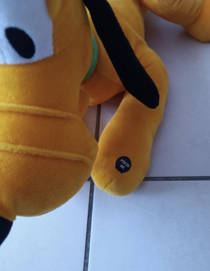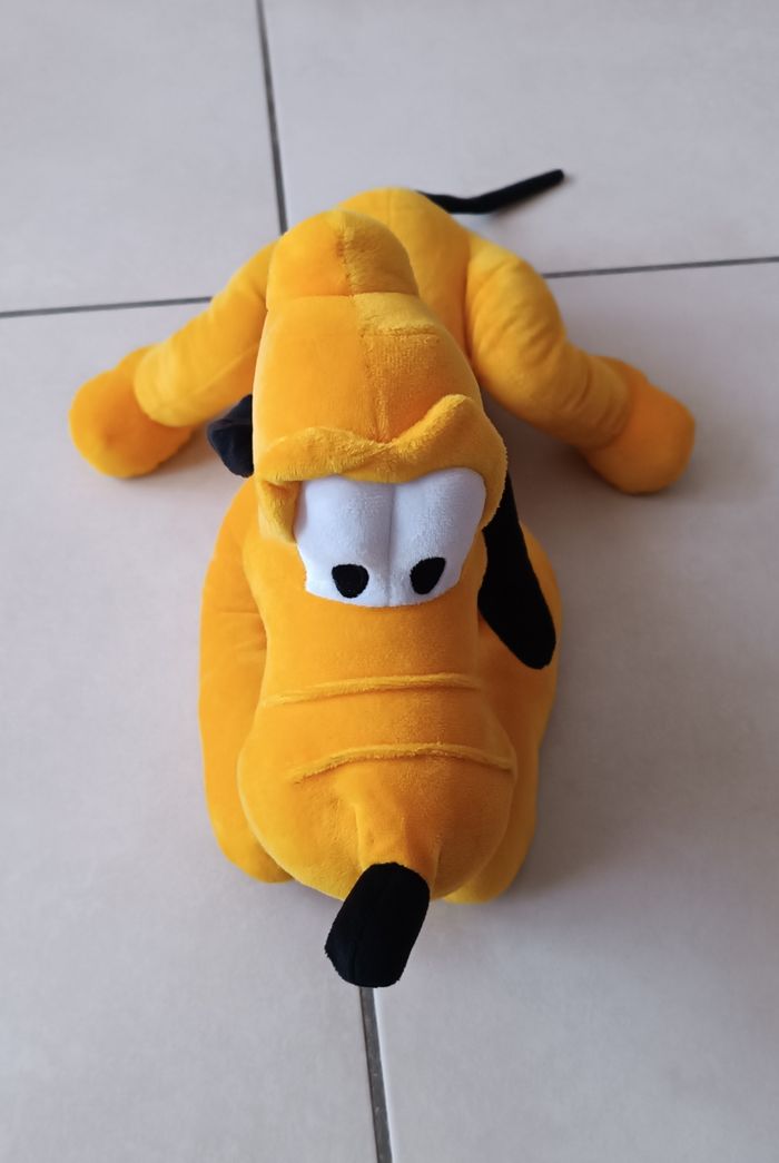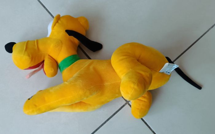 Bonjour, Vends une peluche douce. Pluto, Disney. Quand on lui presse la patte, c'est sonore (bruit de chien ou musique). Longueur avec la queue environ : 57 cm et longueur sans : environ 40 cm Très bon état.
