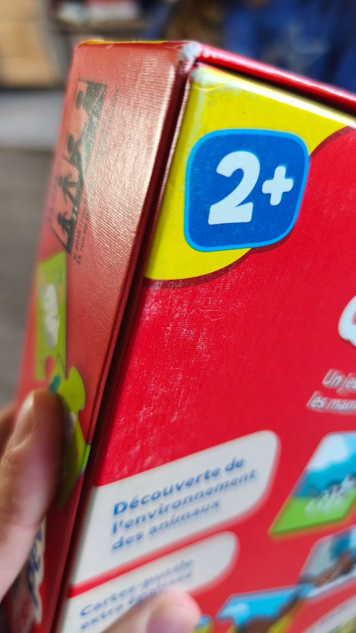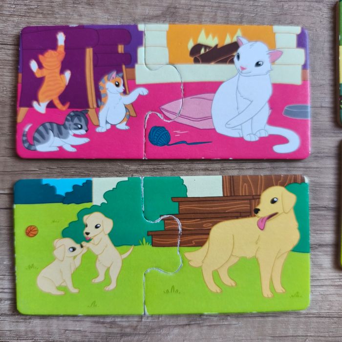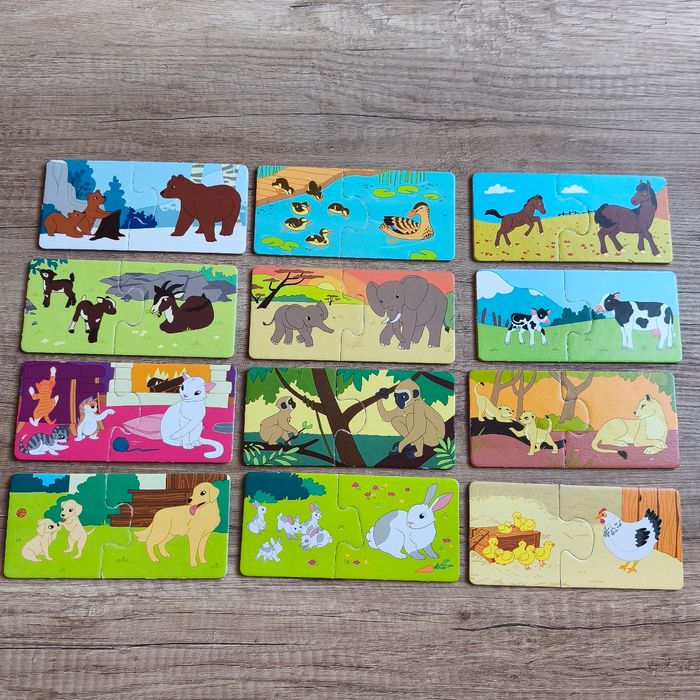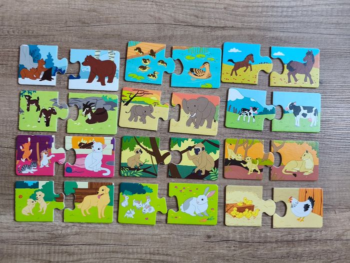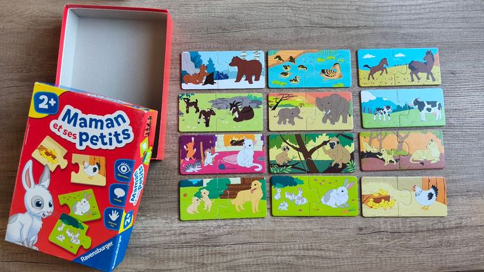 Petit jeu de société pour 2 ans et + Jeu complet 12 paires de cartes puzzle extra épaisse Marque ravensburger Observation/langage/motricité fine En très bon état, a quelques minis traces d'usure au niveau des pièces qui s'emboitent et la boîte se décolore et commence à être abîmé sur les coins (cf photo)