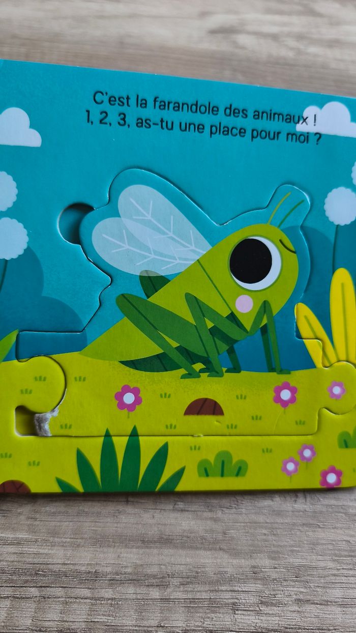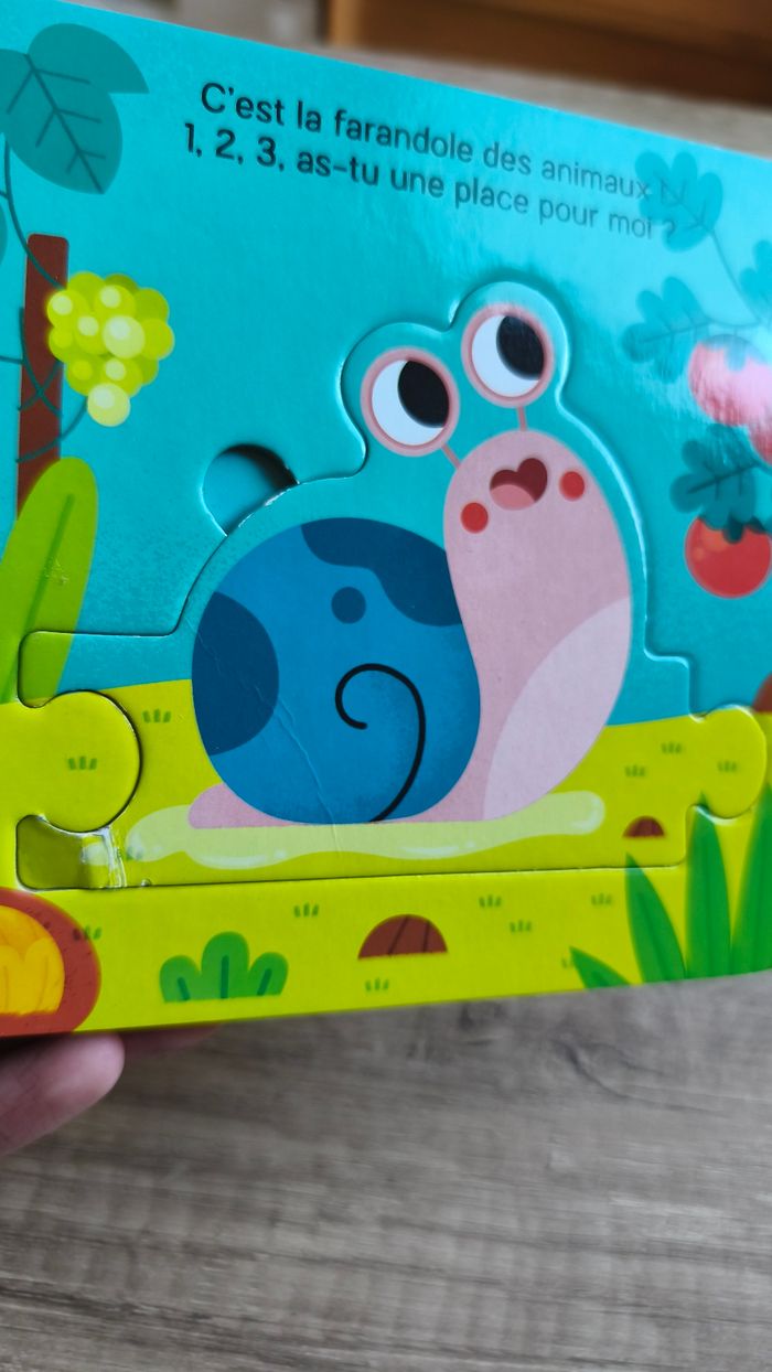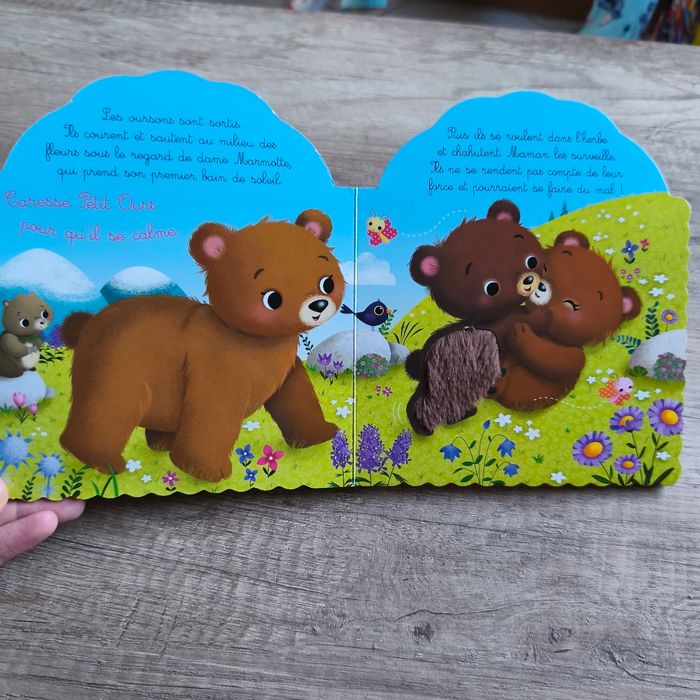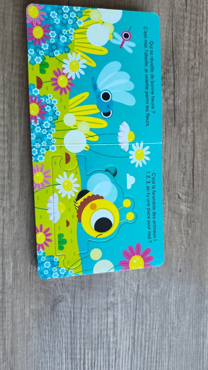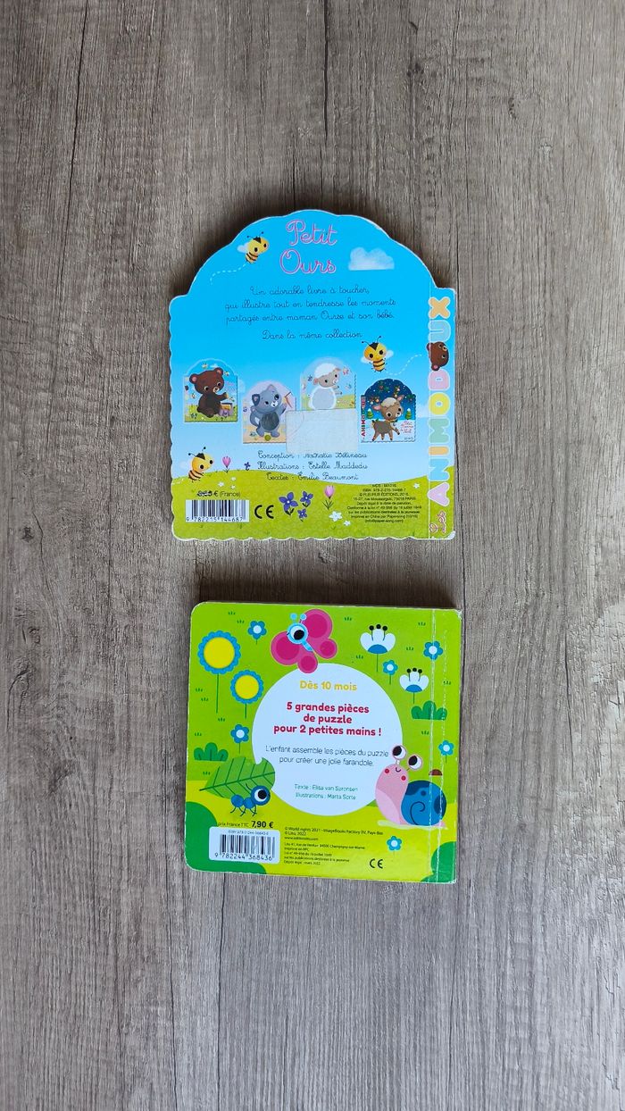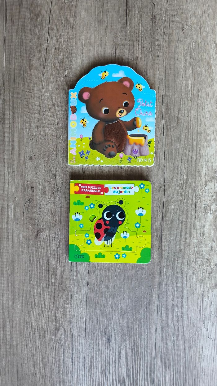 Livre puzzle les animaux du jardin. Des 10 mois 5 animaux En bon état car a 2 pièces d'abimés (cf photo) Livre petit ours: livre à toucher (poils du petit ours). Une histoire toute mignonne entre maman ours et son bebe. En très bon état mais les rebords du livre commencent a s'abîmer
