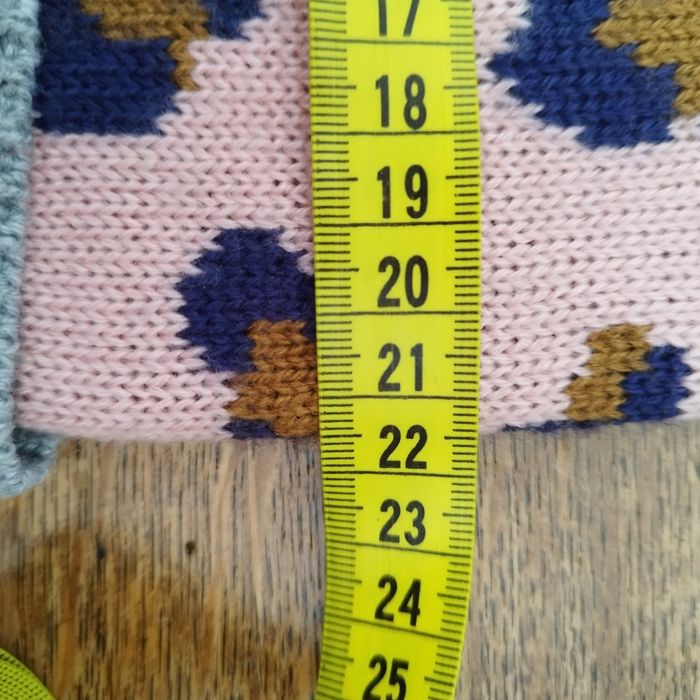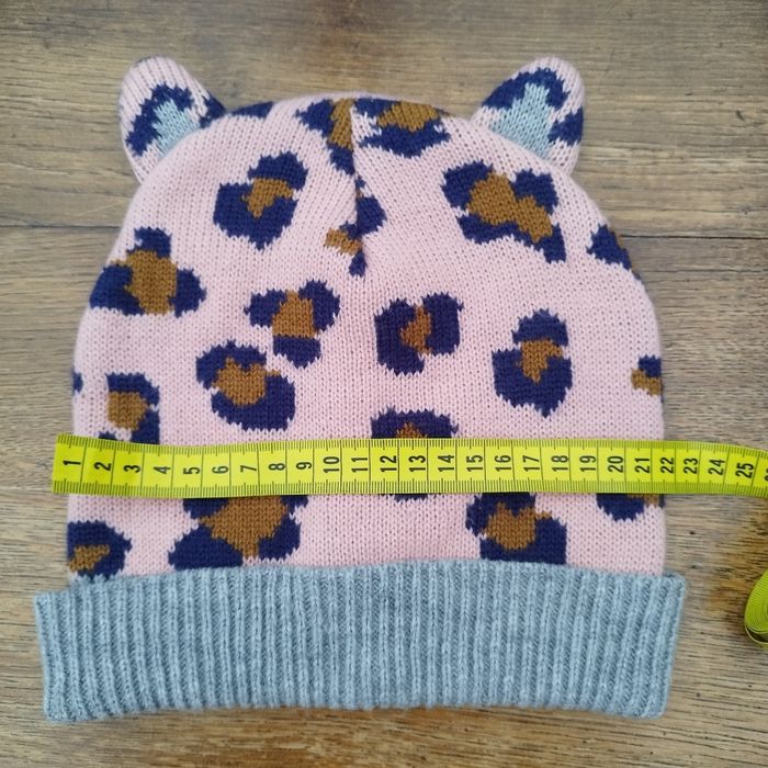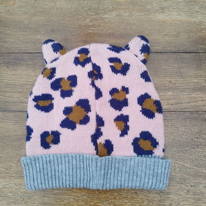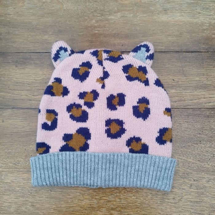 Bonnet léopard tout doux. Tricoté avec un bord-côtelé, il offre une coupe ajustée qui protège efficacement du froid. Avec petites oreilles de chat. C'est écrit M (9-12 ans), mais taille petite, plutôt S (5-8 ans), largeur 21,5 cm.