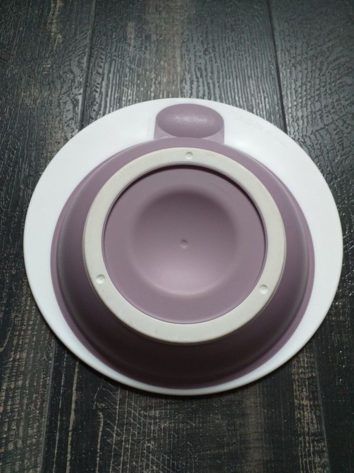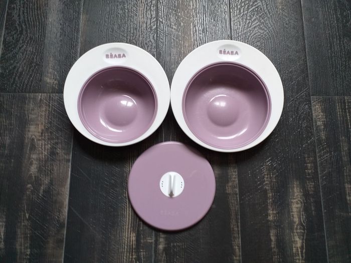 Set avec 2 assiettes spécialement conçues pour maintenir au chaud le repas de bébé avec son couvercle. Compatible micro-onde et lave-vaisselle. - 1 assiette 1er âge de 210 ml. - 1 assiette 2ème âge de 300 ml. - 1 couvercle avec 1 position micro-onde + 1 position maintien au chaud, couvercle qui s'adapte au 2 assiettes. Pratiques avec ses bords larges asymétriques permettant une bonne prise, et le fond extérieur antidérapant. Quelques rayures au fond, néanmoins le set reste en très bon état.