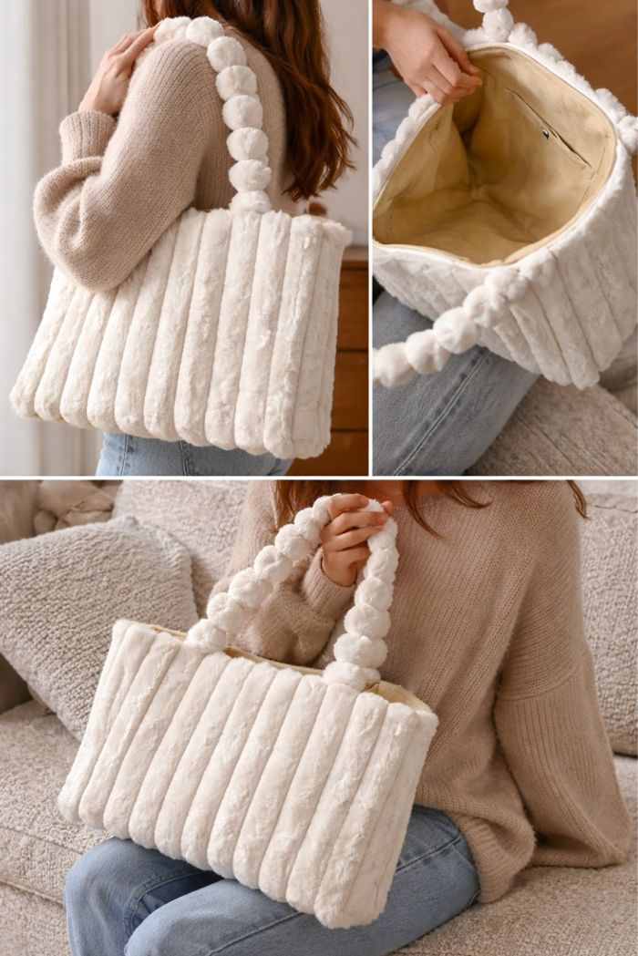 👜 Sac cabas porté épaule – doux & vintage – intérieur velours beige crème Magnifique sac cabas porté épaule, au style vintage et cocooning, idéal pour le quotidien. Son extérieur ultra doux effet peluche lui donne un look tendance et chaleureux, parfait pour l’automne / hiver ou pour un style chic décontracté. ✨ Intérieur en velours beige, très soigné, avec poche intérieure pratique pour téléphone, clés ou portefeuille. Sac spacieux, confortable à porter à l’épaule, aussi bien pour le travail, les sorties que le shopping. ⸻ 📏 Dimensions • Largeur : environ 44 cm • Profondeur : environ 12 cm Hauteur : 7 cm • Porté : épaule ⸻ 🔎 Détails • Style : cabas / tote bag • Porté épaule • Matière extérieure : tissu doux effet peluche • Intérieur : velours beige • Poche intérieure • Fermeture par bouton pression • Couleur : blanc / écru & intérieur beige • État : neuf jamais porté
