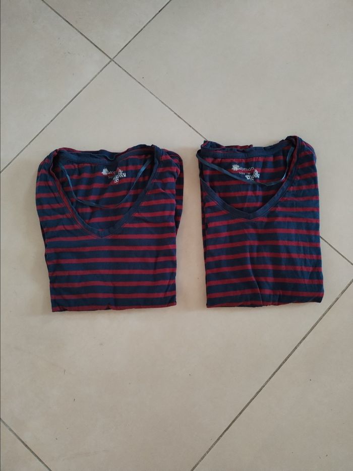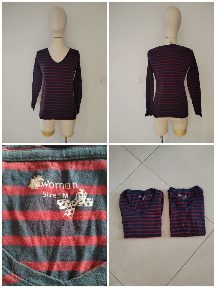 ⚠️PRIX NÉGOCIABLE 🥳😍🥰 Bonjour 👋 Je vends ce lot de 2 tee-shirts bleu marine et rouge vintage femme à manches longues taille M/38 TBE 👕-Type de produit: tee-shirt 🏷-Marque: Kiabi 📏-Taille: M/38 🎨-Couleurs: Bleu marine et rouge -Caractéristiques: col en V, rayé. Les mensurations: De l'épaule gauche à droite: 32 cm De l' aisselle à aisselle: 43 cm Longueur du haut en bas: 57 cm Longueur des manches: 55 cm Article de très bonne qualité. Vêtements stoker à l'abri de l'humidité. Pour ceux et celles qui font des allergies au poil d'animaux ou à la fumée de cigarette, j'informe que je n'ai pas d'animaux et je que ma maison et non fumeurs.  N'hésitez pas à regarder mon compte vendeur, pour trouver des pépites ! J'accepte tout les monde de livraisons que propose beebs 💳 Paiement: J’accepte le paiement que propose la plateforme beebs. 🖊📮📬Très réactive aux messages. 📦 Envoie soigné et rapide. Bon shopping sur beebs 🛍🛒