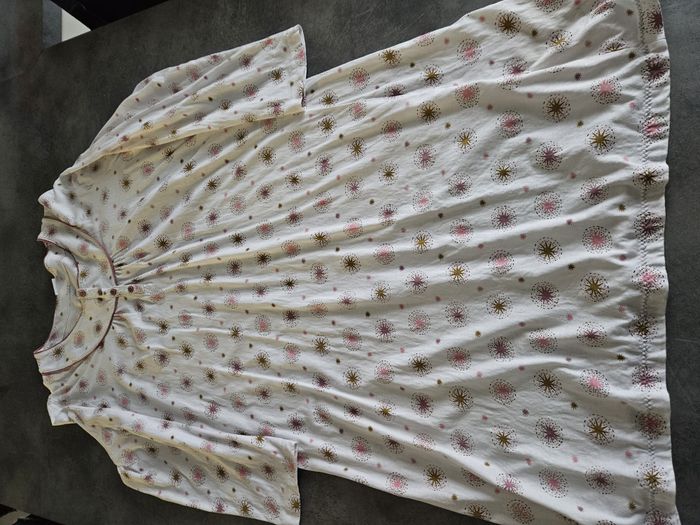 Chemise de nuit Longue Coupe femme Pur coton Coloris blanc Imprimé rose étoiles Boutons sur le col Mesures : - Epaule à épaule : 42cm - Aisselle à aisselle : 54cm - Hauteur totale : 99cm Marque : Damart Composition : 100% coton Taille : L. Voir mesures Etat : Très bon état Envoi ou remise en main propre #chemisedenuit #chemisedenuitfemme #damart #tailleL #chemisedenuitpurcoton