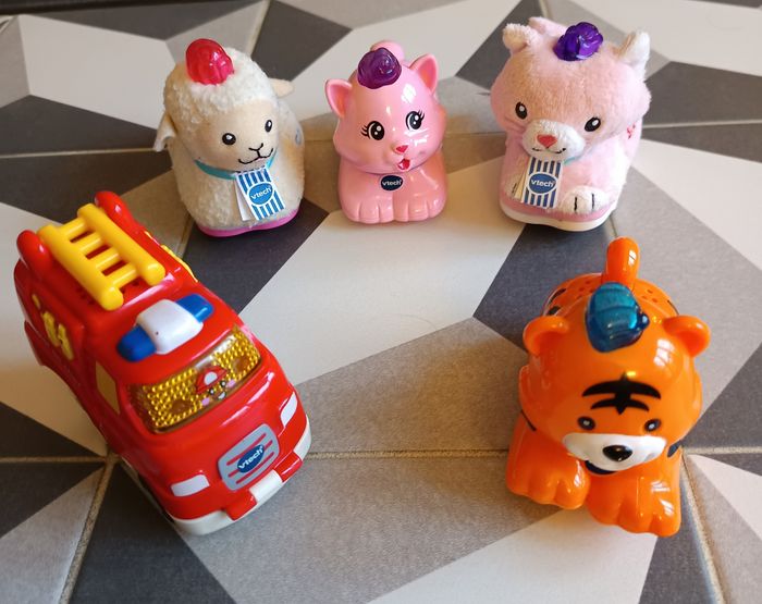 1 camion de pompiers Jeff 1 tigre Gribouille 1 chat Bidou 1 chat Mistinguette 1 mouton Chantilly Tous fonctionnent. Piles incluses. En parfait état.