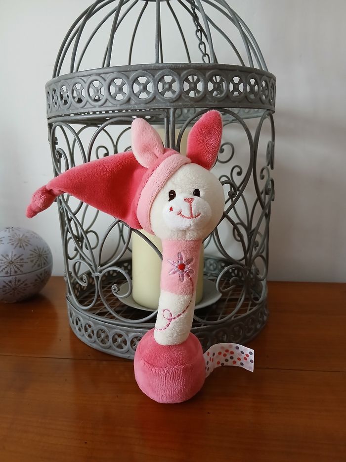 Doudou facilement préhensible par le bébé. Lapinou entièrement rembourré; yeux et museau brodés; bonnet non amovible. Bruit de grelot quand on le secoue. Fond plat. Hauteur totale de 19 cm [ jusqu'aux oreilles ]; lavable à 30°. Étiquette de la marque coupée // voir photos pour détails