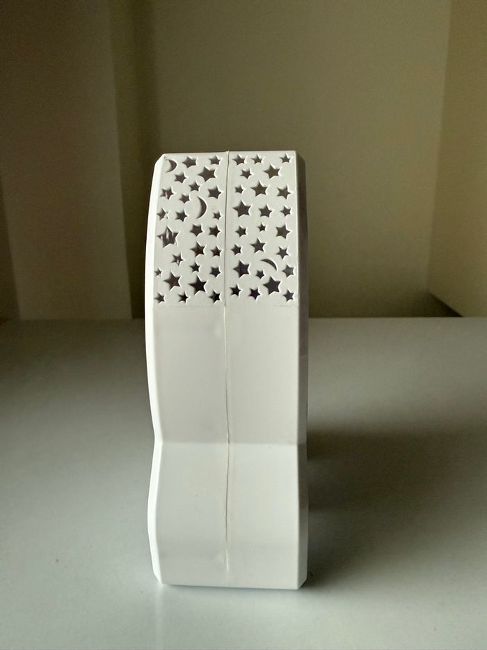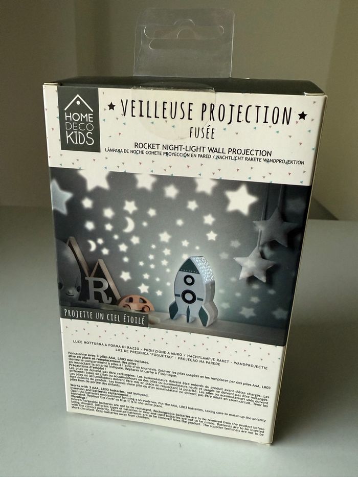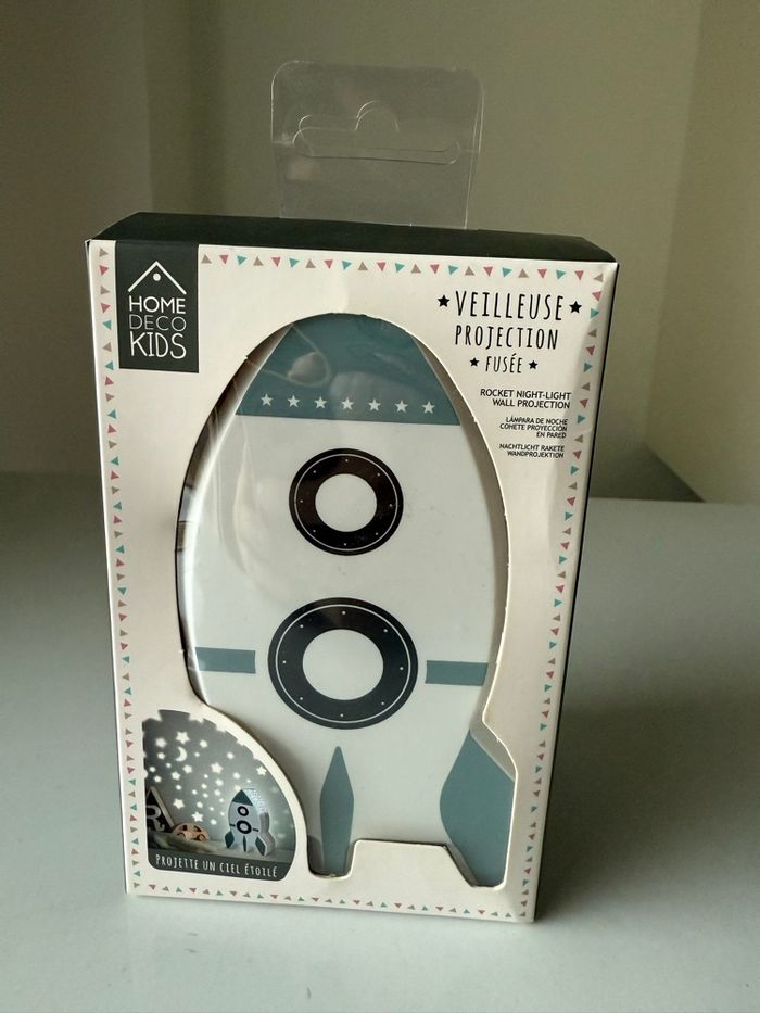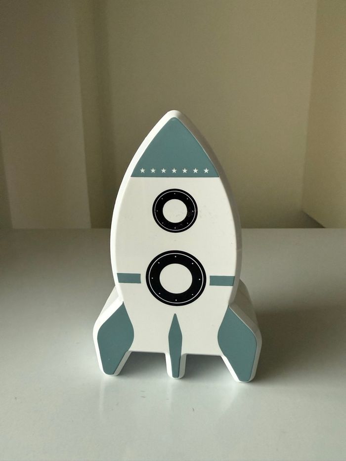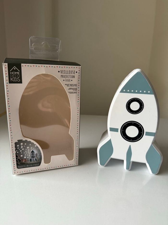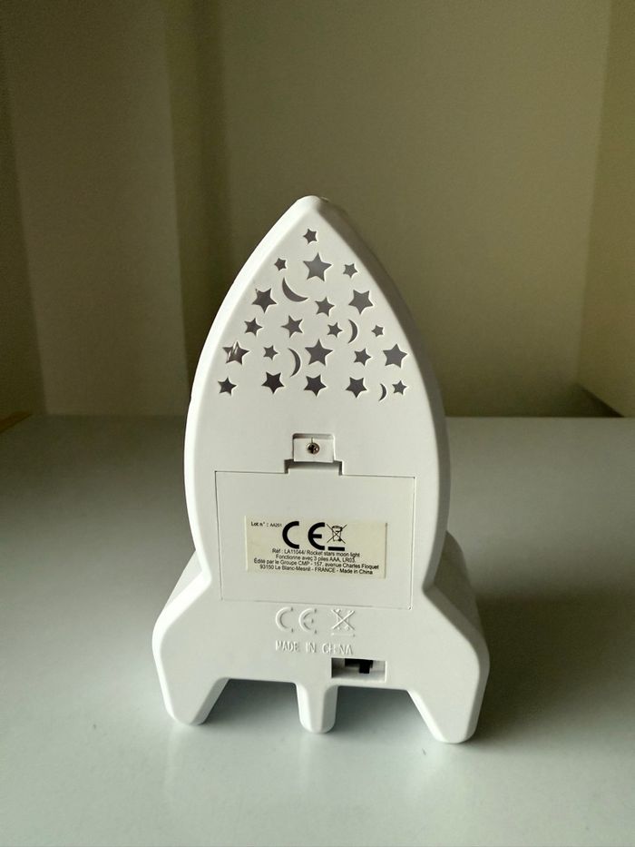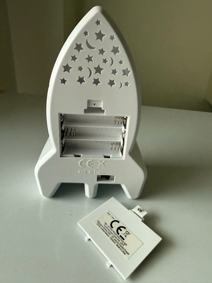 Veilleuse-Projecteur Ciel Etoilé Mural en Forme de Fusée en très bon état et fonctionnelle. Offrez à votre enfant cette veilleuse de projection fusée. Elle projette un ciel étoilé et décore joliment une chambre d'enfant ! Conception en plastique ABS. Pour une douce nuit au pays des rêves étoilés ! Dimensions : 9,3 x 5,7 x H15,3cm. Fonctionne avec 3 piles AAA, LR03 non incluses. Couleur : blanc.