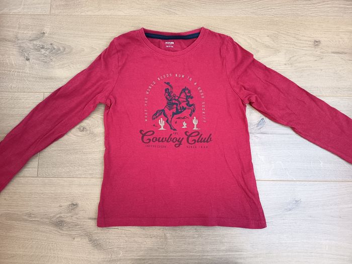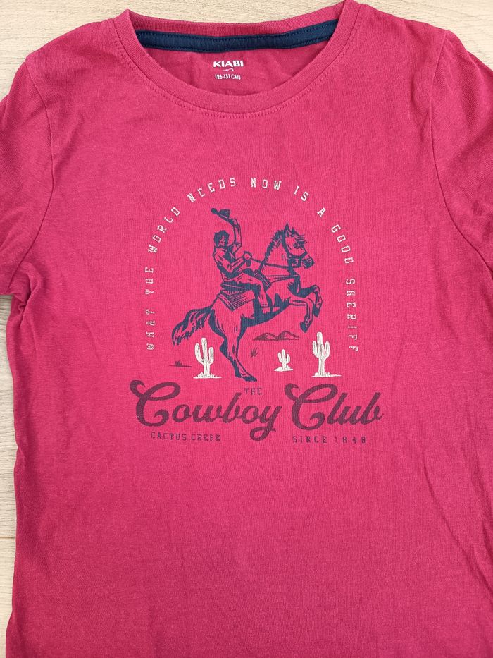 T-shirt rouge, thème cowboy chevaux. Très bon état. 👉 Maison non fumeur sans animaux. 👉 Remise en main propre secteur Lille CHR possible. 🌺Voir mes autres annonces beaucoup de cosmétiques bio, vegan, solide en vente mais aussi livres, jouets, vêtements femme et enfants, chaussures, accessoires, bijoux... RÉDUCTION SUR LOT DES 2 ARTICLES🌺 📦 Envoi rapide des colis.
