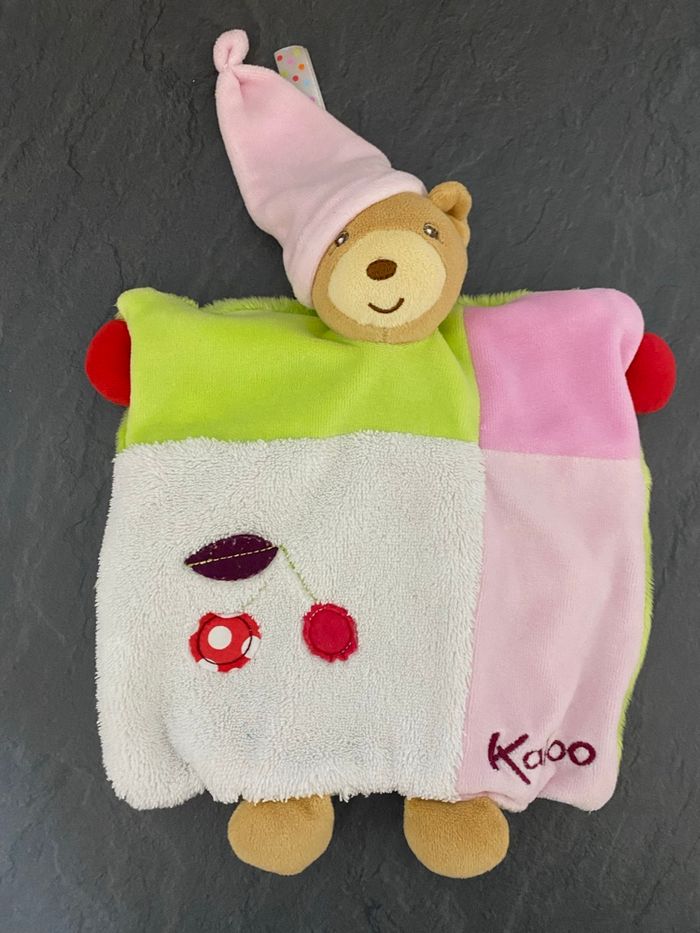 Doudou ours plat Kaloo marionnette cerise