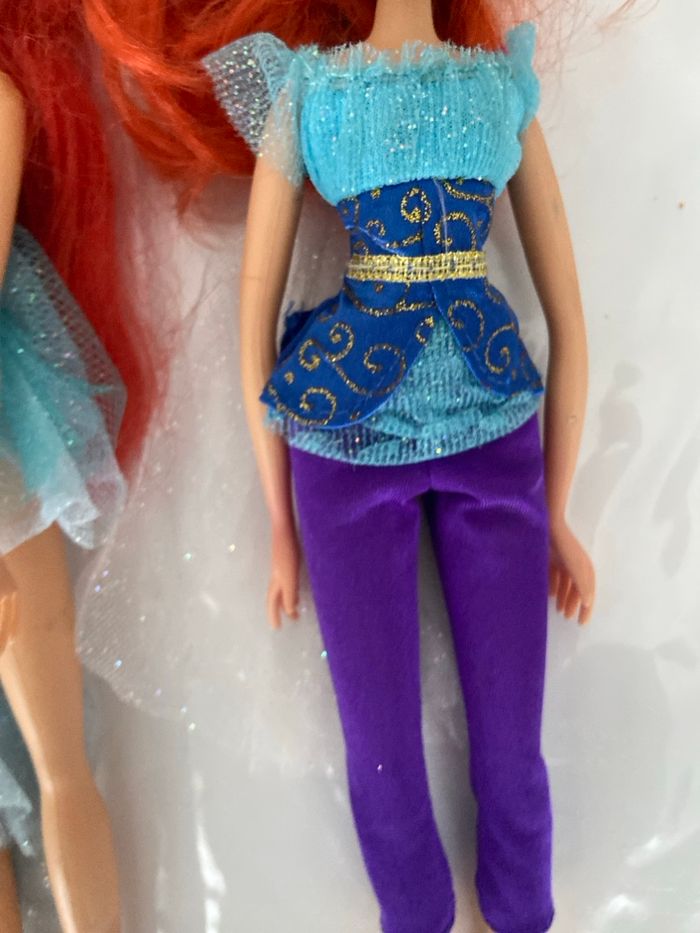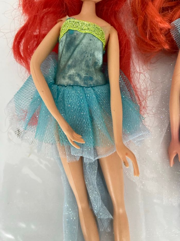 Vends un lot de deux poupées à l'effigie de Bloom, la fée de la Flamme du Dragon. Ces modèles possèdent le visage caractéristique des versions produites par Jakks Pacific, très appréciées pour leur ressemblance avec le dessin animé. Détails du lot : • Bloom en tenue de bal/soirée : Porte une robe courte bleu turquoise satinée avec un bustier vert pomme et un voile scintillant. Elle est vendue avec ses chaussures montantes roses translucides d'origine. • Bloom en tenue citadine : Porte un haut bleu à paillettes avec des motifs dorés et un pantalon (legging) violet. État : • Les poupées sont en bon état général. • Le maquillage du visage est intact et bien net. • À noter : Les cheveux auraient besoin d'un petit brossage/soin pour retrouver leur fluidité d'origine. Les articulations sont fonctionnelles.
