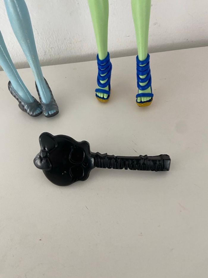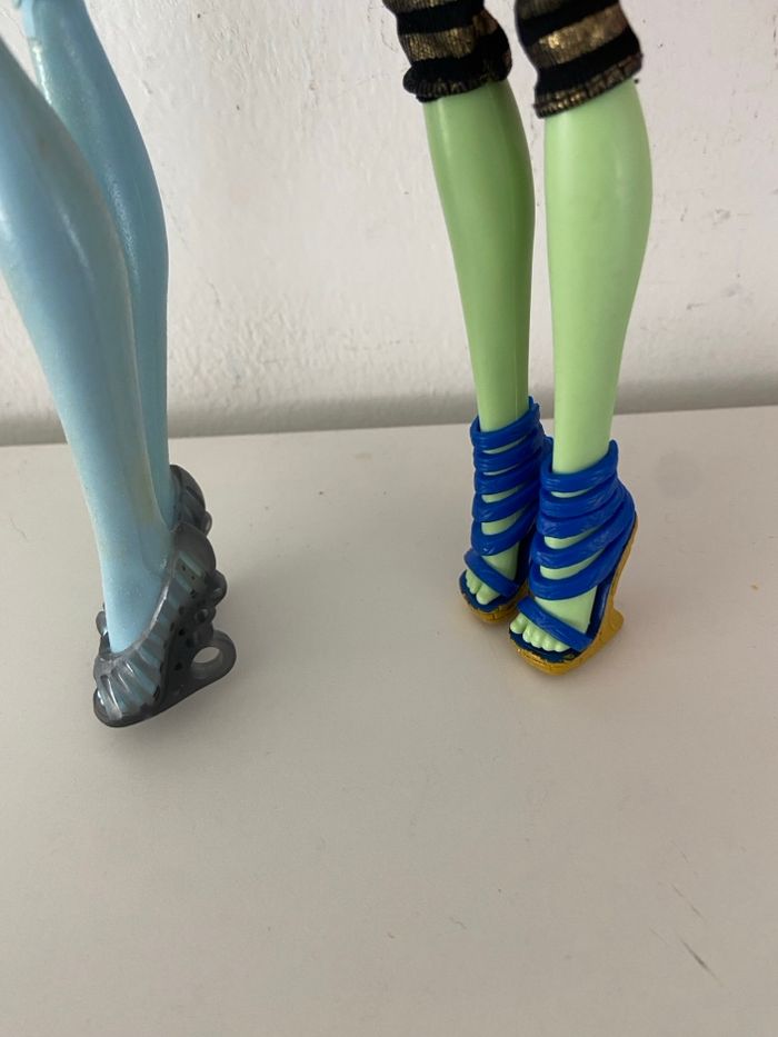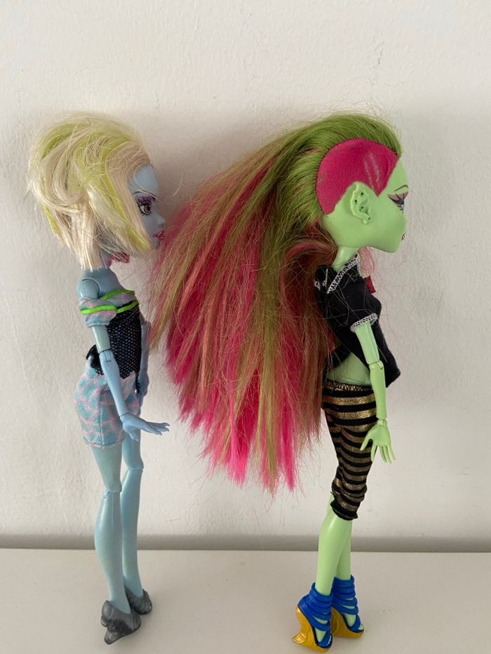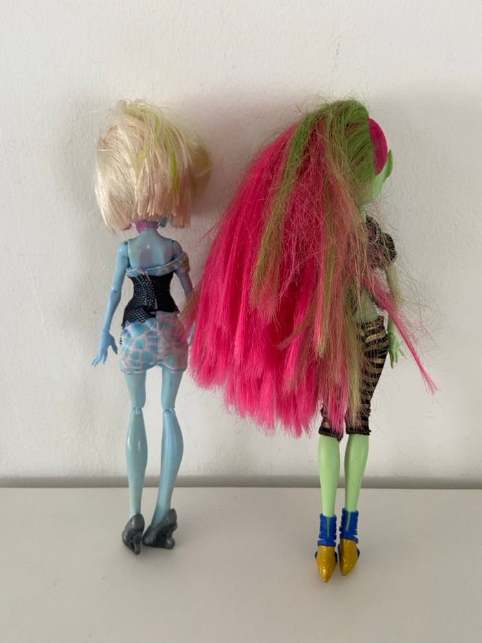 Vends un lot de deux poupées Monster High originales de Mattel. Idéal pour compléter une collection ou pour offrir. Détails du lot : • Abbey Bominable : Poupée à la peau bleue pailletée. Elle porte une robe courte avec un motif géométrique rose et bleu, ainsi qu'un haut en résille noire. Elle possède ses chaussures grises translucides d'origine. • Venus McFlytrap : Poupée à la peau verte. Elle porte un haut noir avec un col rose/rouge et un legging court à rayures horizontales noires et dorées. Elle est équipée de ses sandales compensées bleues avec des semelles dorées. • Accessoire inclus : Une brosse noire en forme de crâne Monster High. État : • Visage : Le maquillage des deux poupées est impeccable et très détaillé. • Corps : Les articulations sont en bon état. • Cheveux : Les cheveux sont colorés et volumineux, mais mériteraient un léger brossage pour retrouver toute leur souplesse. • Vêtements : En bon état, propres et bien ajustés.