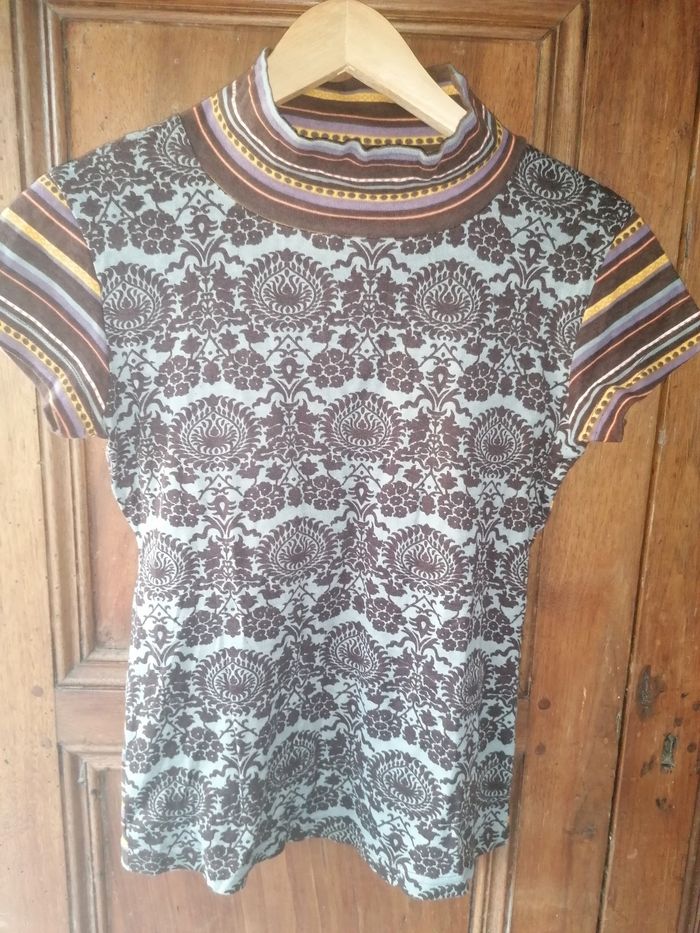 T-shirt col montant manches courtes femme M Très bon état, tout coton. Gros, marron, moutarde, violet, orange, très coloré, très sympa. Couleurs vives. Près du corps. Mettre un T-shirt manches longues dessous ou un petit gilet en hiver. Faites un lot, 10% de remise dès 5 articles achetés ! 🤎🩶🧡💜💛