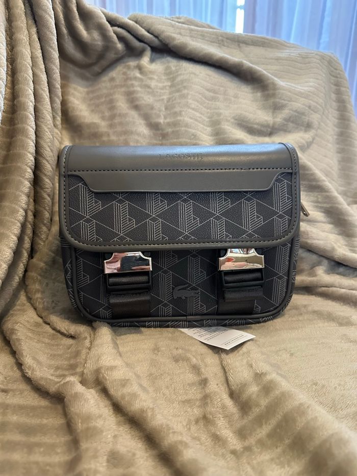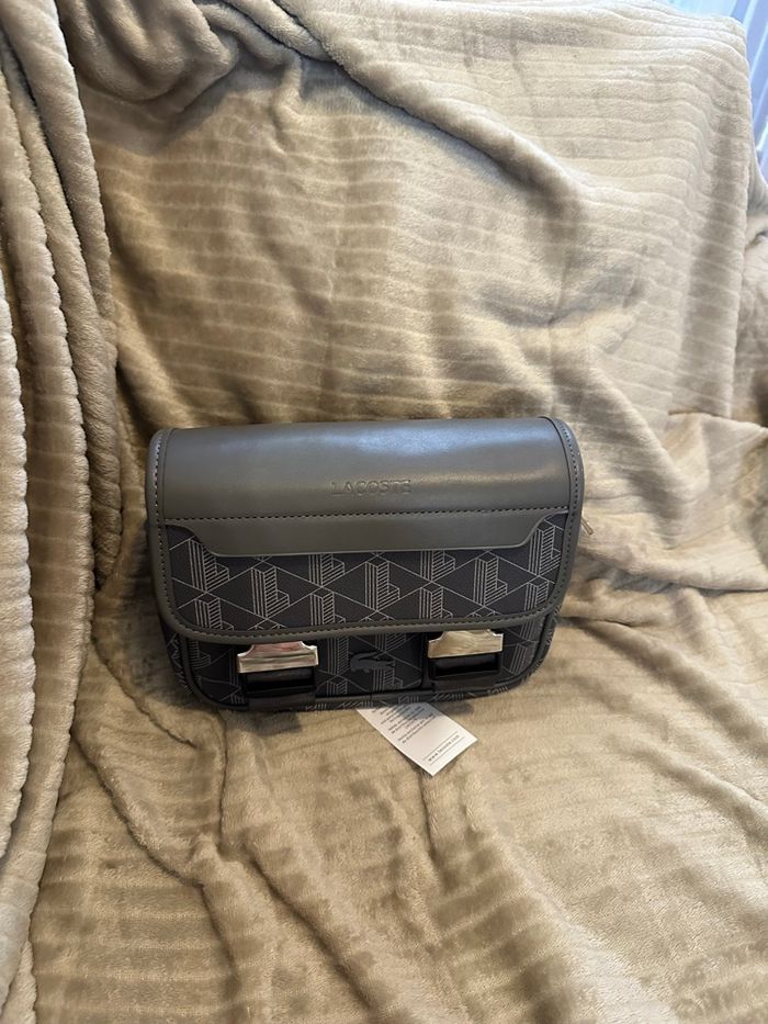 Sac Lacoste original, coloris gris/noir avec motifs signature. Neuf, jamais porté, étiquette encore attachée. Compact, pratique et élégant, parfait au quotidien. 📦 Envoi rapide 💬 Disponible si besoin de plus d’infos
