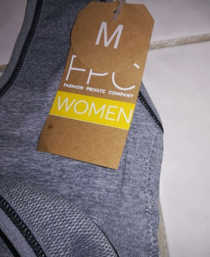 Lot 2 brassières de sport grises, taille M, neuves avec étiquette. Marque FPC WOMEN. J'en ai 2 autres noires et 1 grise dans mon dressing.