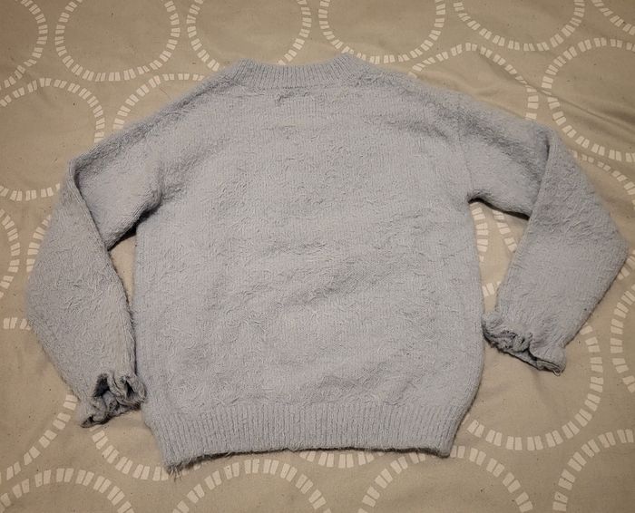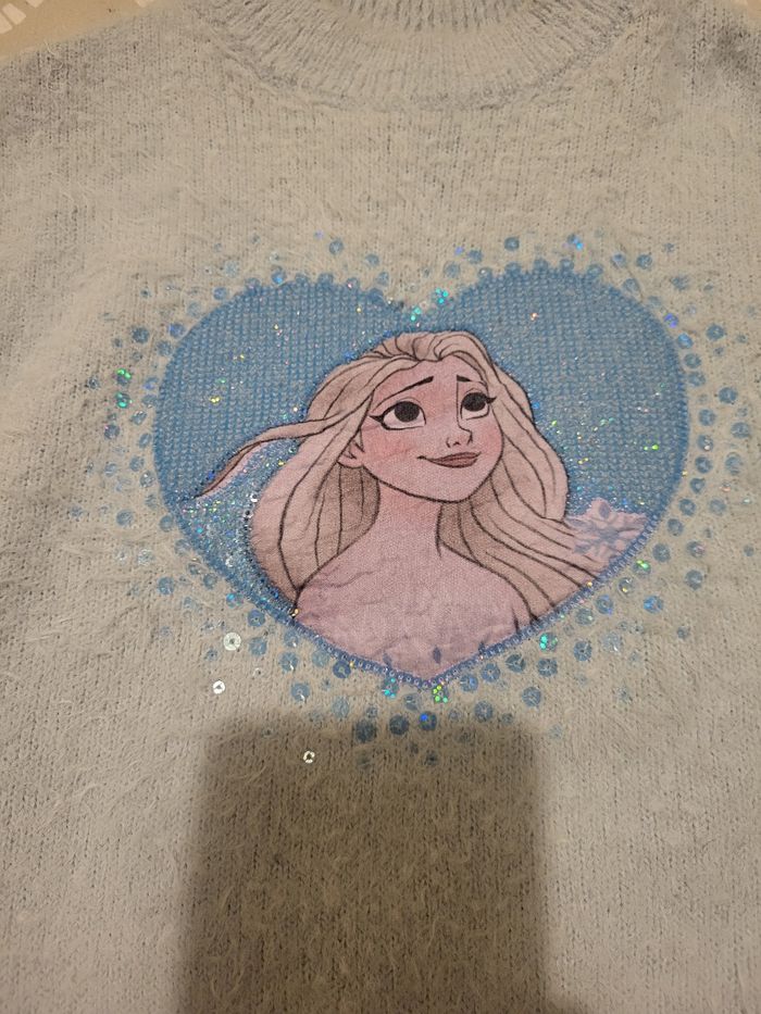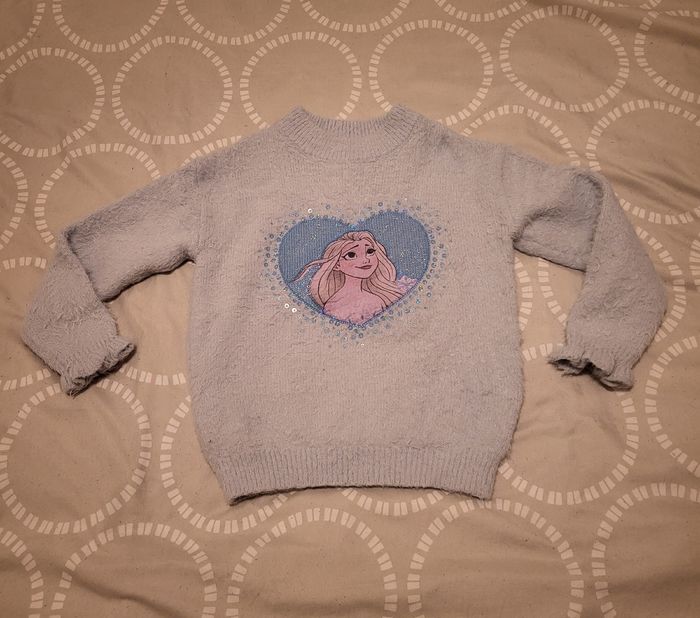 Pull Elsa de la reine des neiges. Pull en finition douillette avec motif Elsa. Taille 5 ans (110 cm). Couleur un peu délavé et un peu moins doux qu'au début du au lavage. Motif un peu abîmé voir 📷