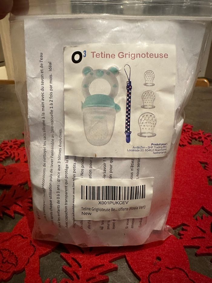 Je vends une tétine grignoteuse neuve vendue avec 3 tétines de tailles différentes et un cordon qui permettent de faire découvrir des goûts aux bébés.