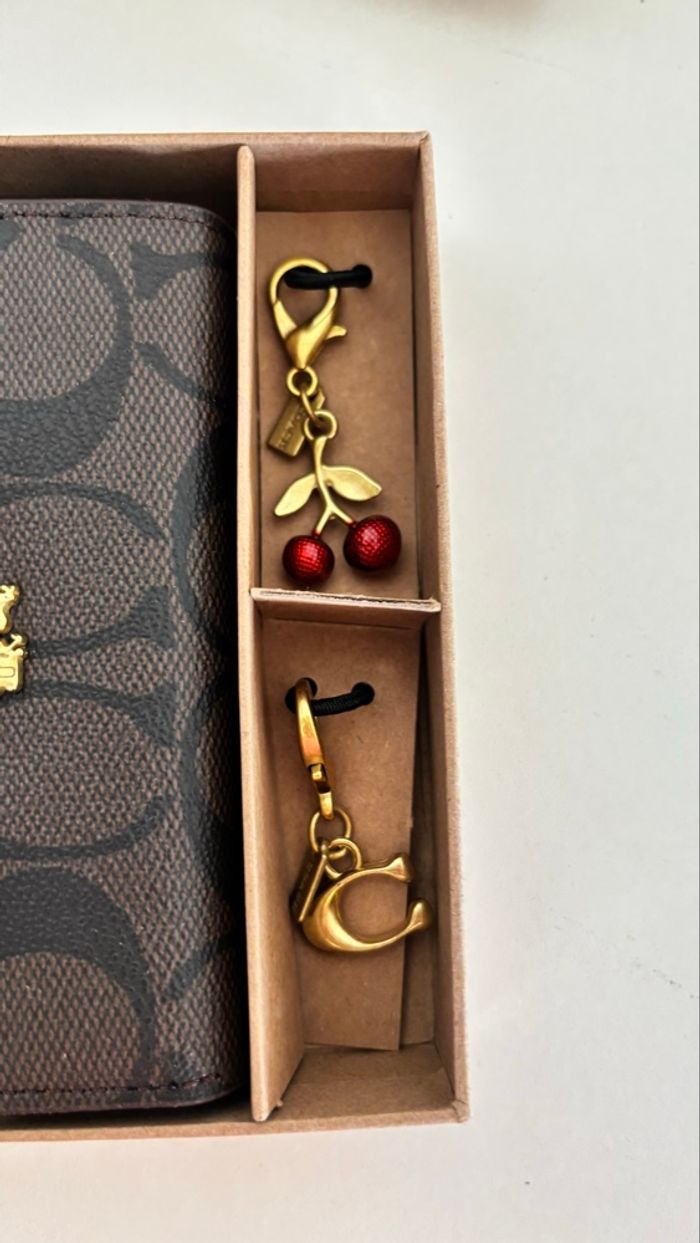 -Portefeuille Coach Marron •En excellent état -Livré avec sa boîte et ses deux pendentifs -Expédition rapide (24/48h) Largeur: 13 cm Hauteur: 9cm