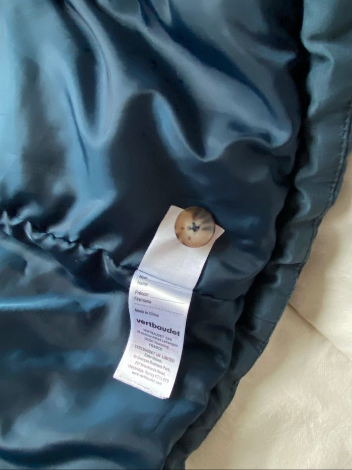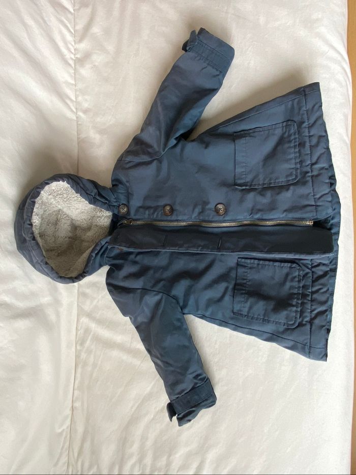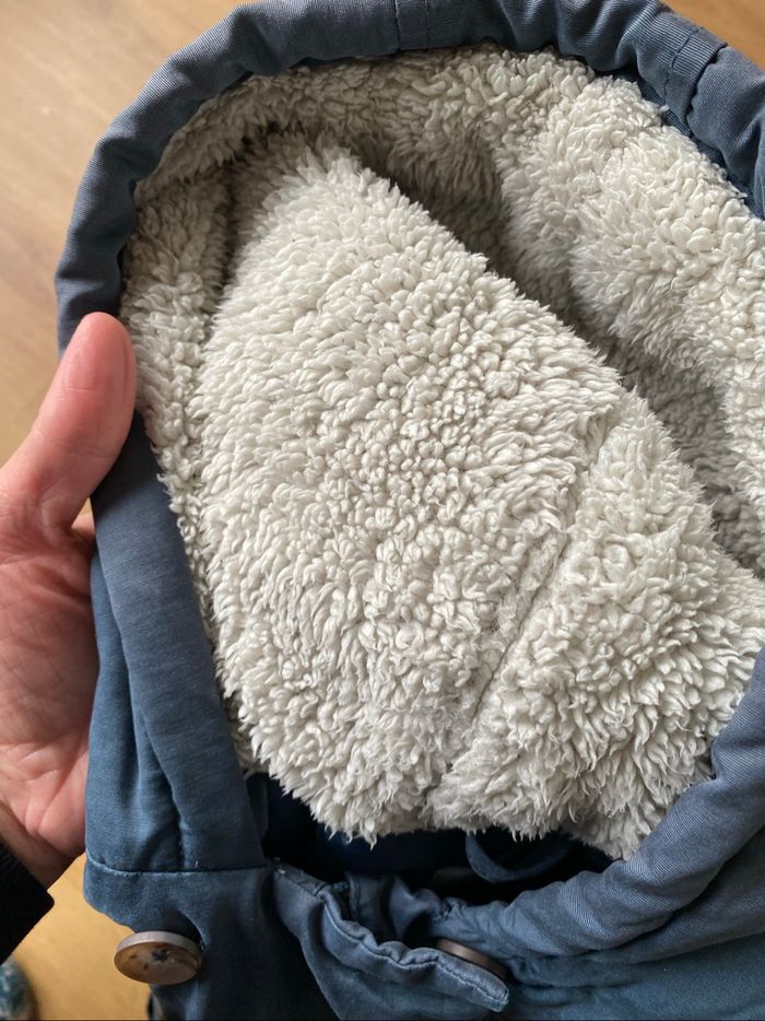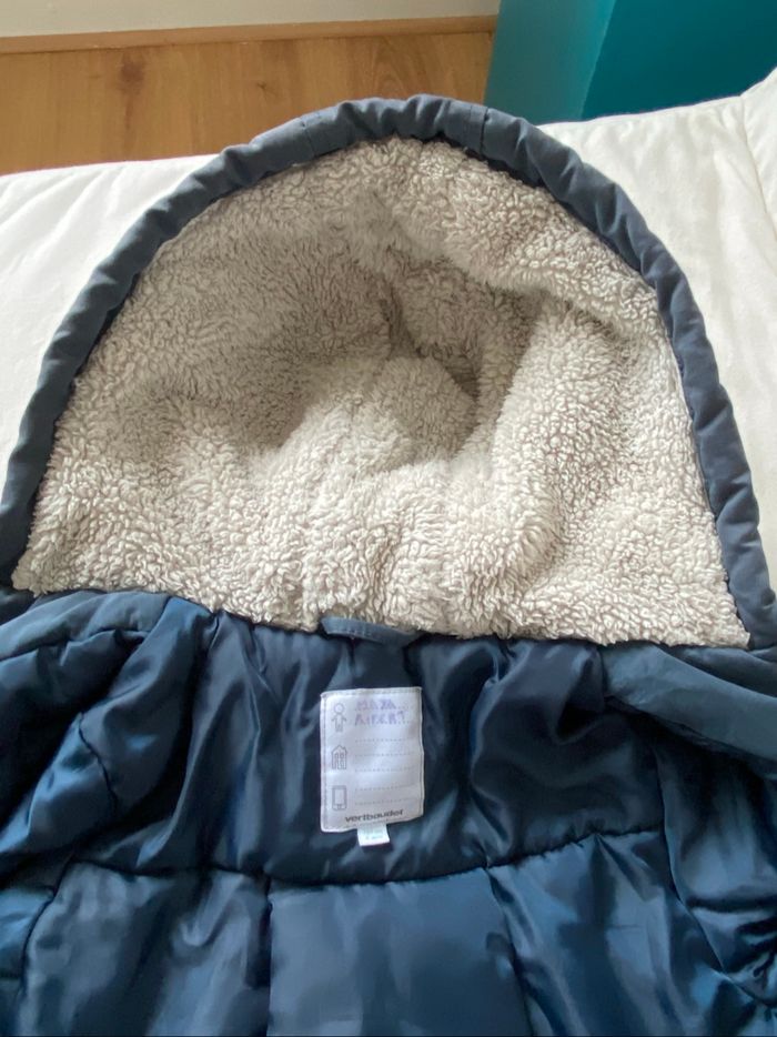 Manteau chaud Vertbaudet bleu marine, taille 4 ans. Deux poches, capuche moumoutée. Fermeture éclair et boutons. Doublure en parfait état. Défaut à noter : la moumoute de la capuche, à l’origine blanche, a grisé avec les lavages (voir photo). Le nom de l’enfant est noté sur l’étiquette du col.