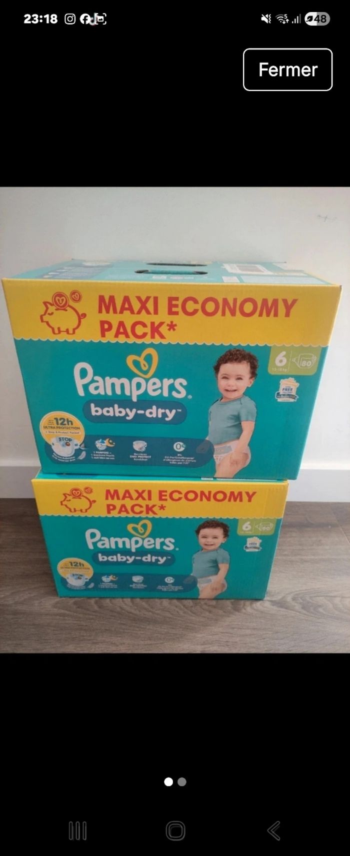 Lots de 2 cartons couches pampers taille 6