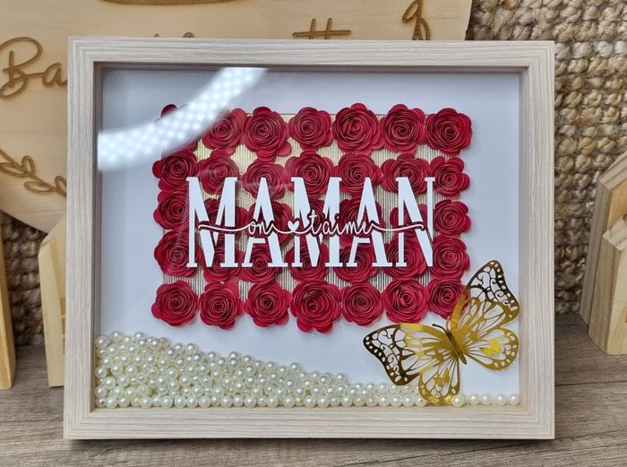 Un cadeau unique pour une maman unique ❤️ ​Offrez un concentré d'amour avec ce cadre artisanal entièrement réalisé à la main. Plus qu'une simple décoration, c'est un souvenir précieux qui illuminera son intérieur. ​Le design : Un lettrage élégant "Maman on t'aime" entouré d'un jardin éternel de fleurs rouges en 3D. ​La touche magique : Des perles mouvantes qui dansent à l’intérieur du cadre et un papillon doré délicatement posé pour apporter une note de lumière. ​Format : 22x18 cm. ​✨ 100% Personnalisable : La création ne s'arrête pas là ! Je finalise ce cadre en ajoutant les prénoms des enfants pour en faire un objet vraiment unique au monde. ​C’est le cadeau idéal pour la fête des mères, un anniversaire ou juste pour lui dire "merci". ​📩 Envoyez-moi les prénoms en MP pour personnaliser le vôtre