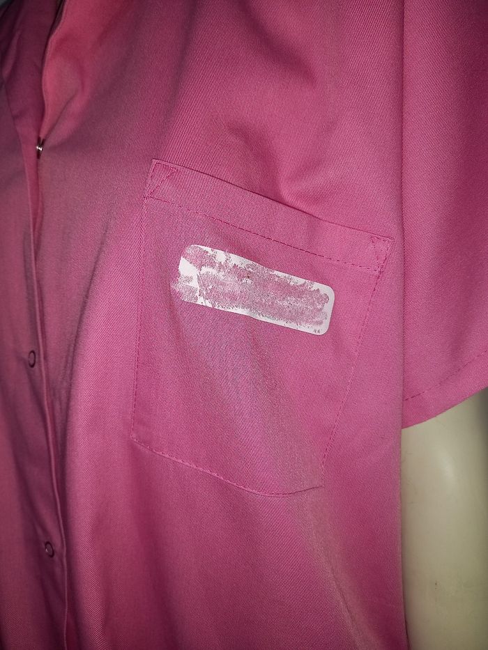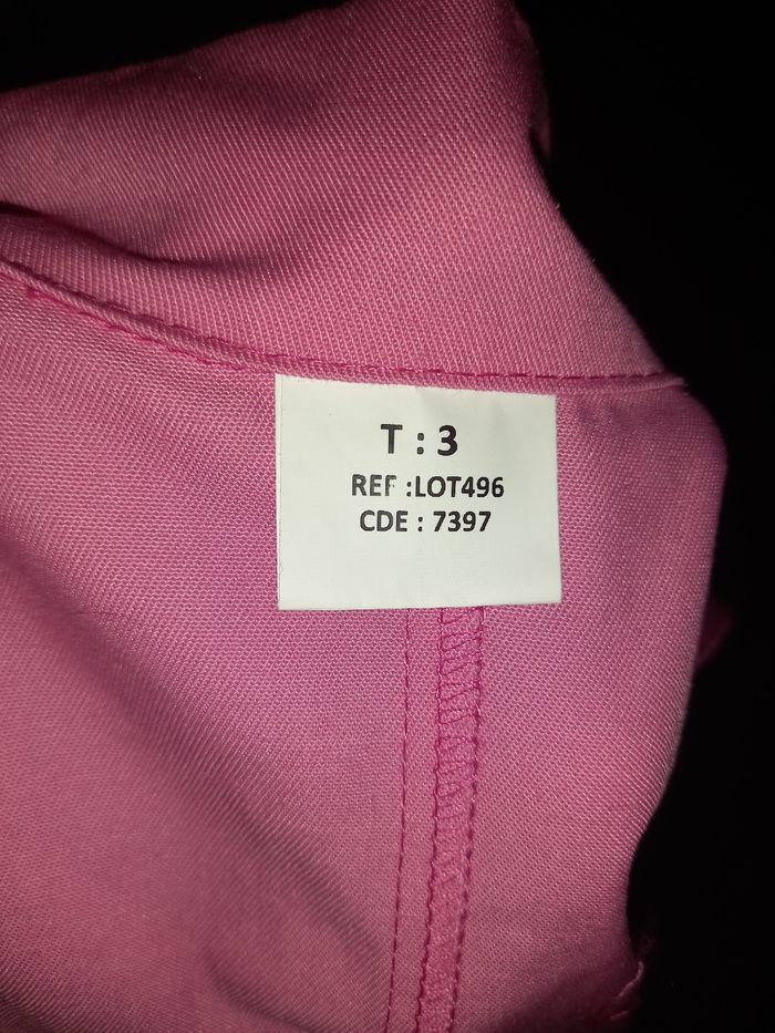 Blouse de travail Taille 3 = 44/46 La blouse est en très bon état car elle a été peu portée mais j'ai dû supprimer l'étiquette avec le nom de ma fille mais il reste des résidus de l'étiquette