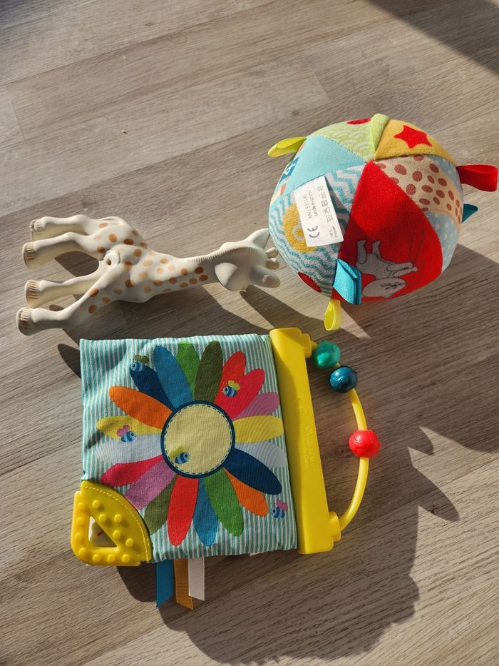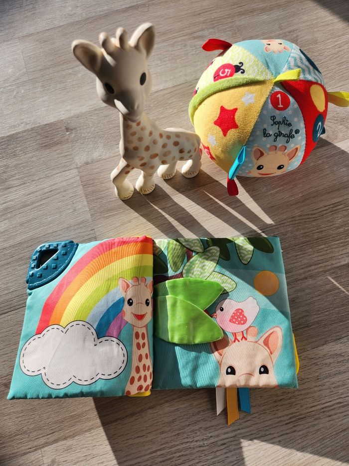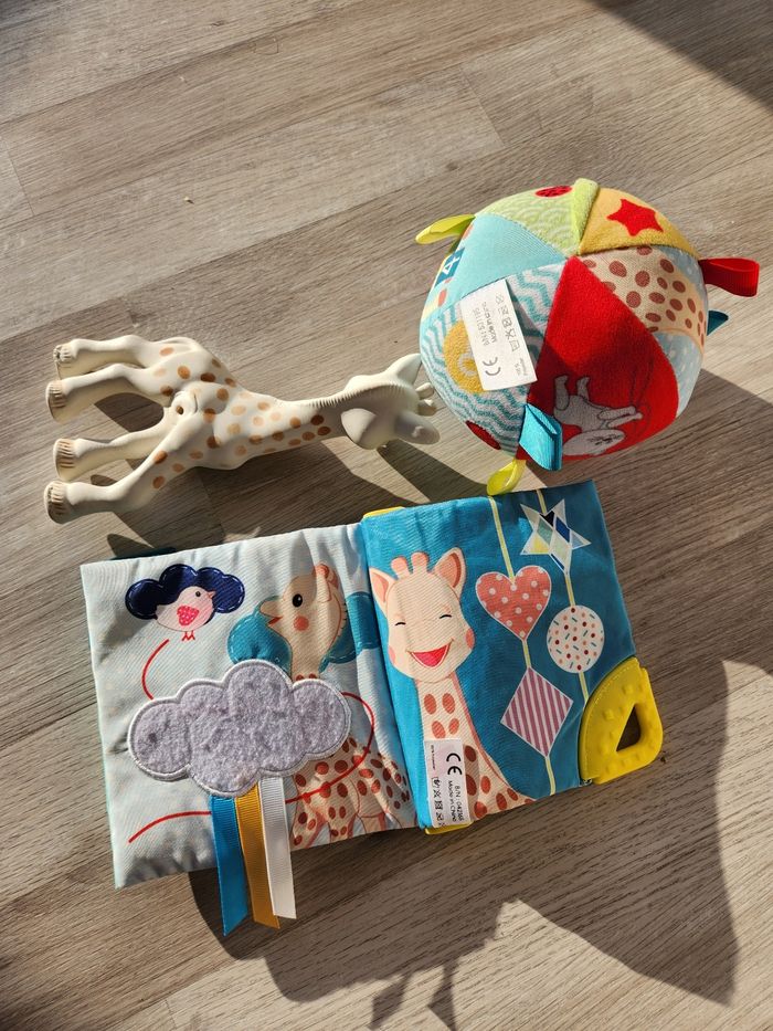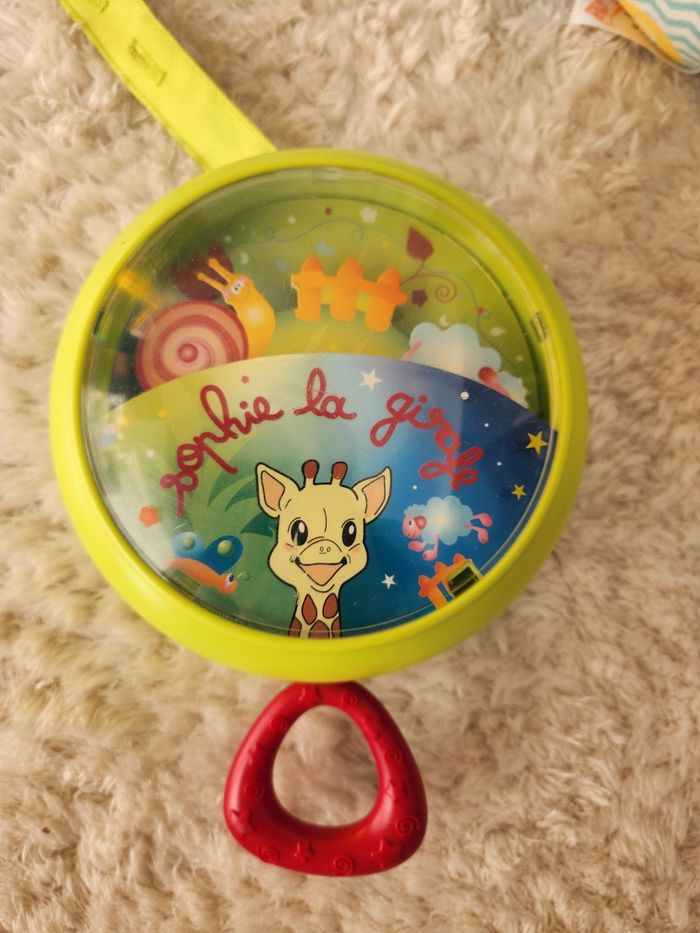 Lot de 4 jouets Sophie la girafe. Une veilleuse musicale à accrocher Une balle Un livre Une girafe un peu abîmé