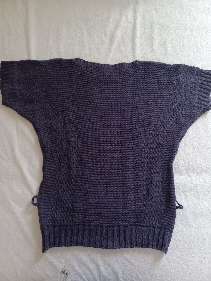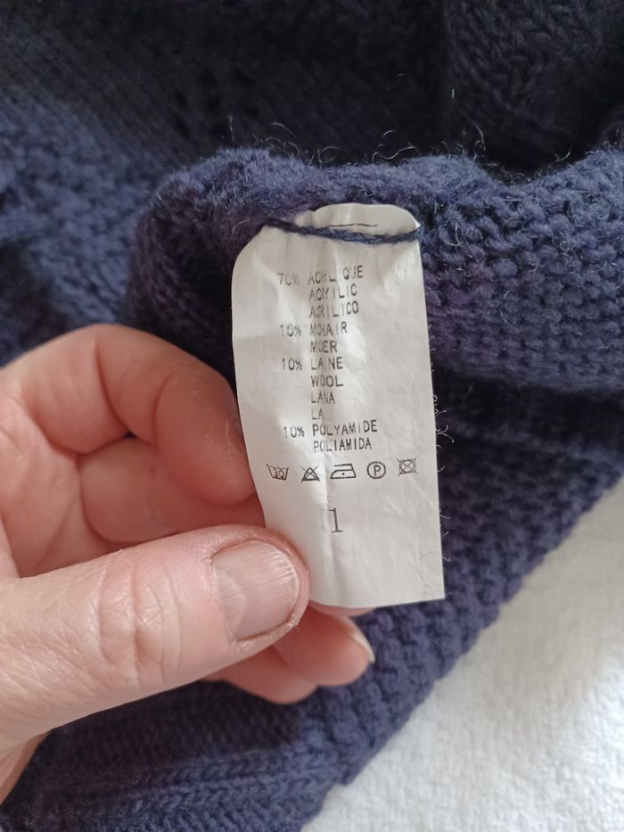 Manches tombantes, coupe large. Avec passant sur le côté (coutures) pour être porté avec une ceinture (non fournie) Matière douce et chaude. 70% acrylique, 10% laine, 10% mohair,10% polyamide Lavage 30°