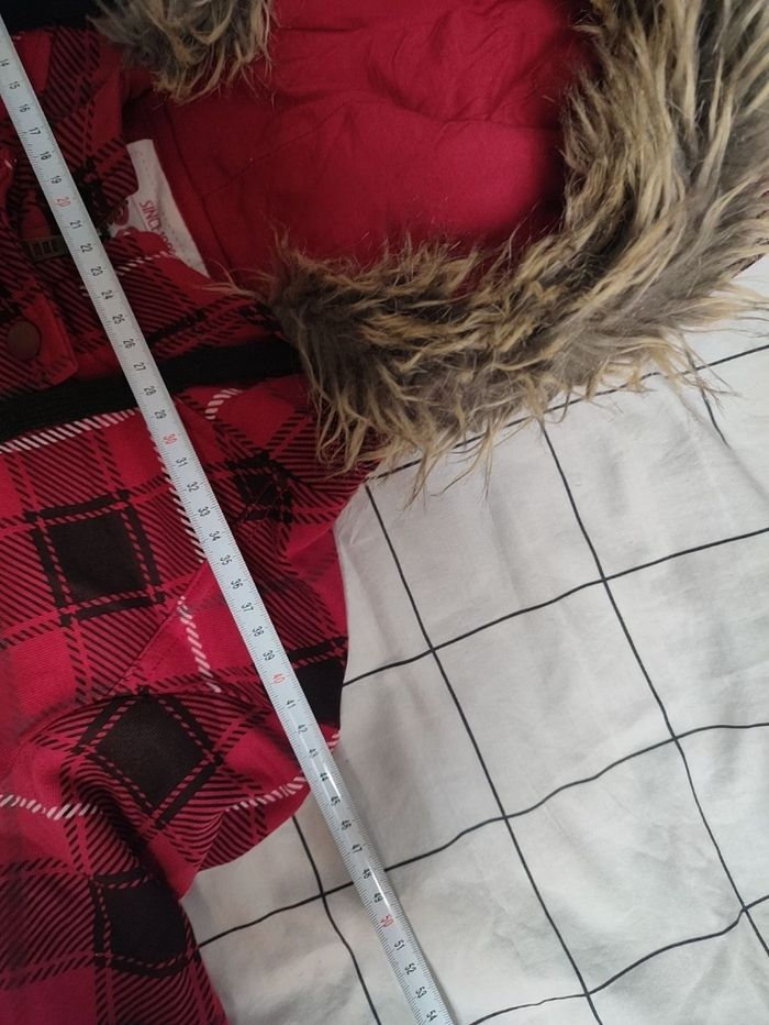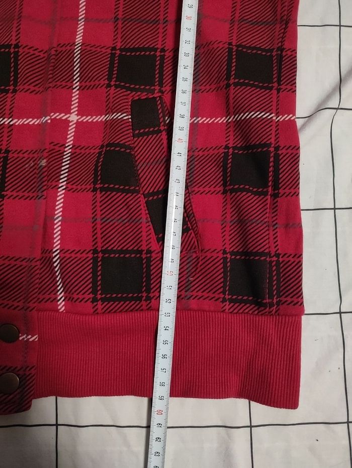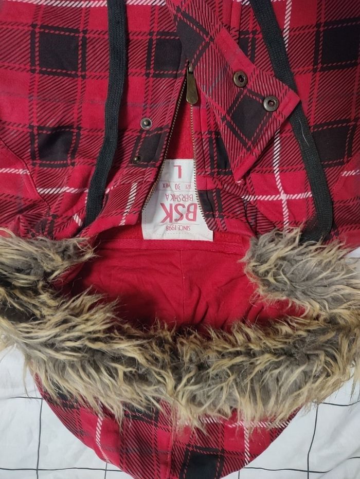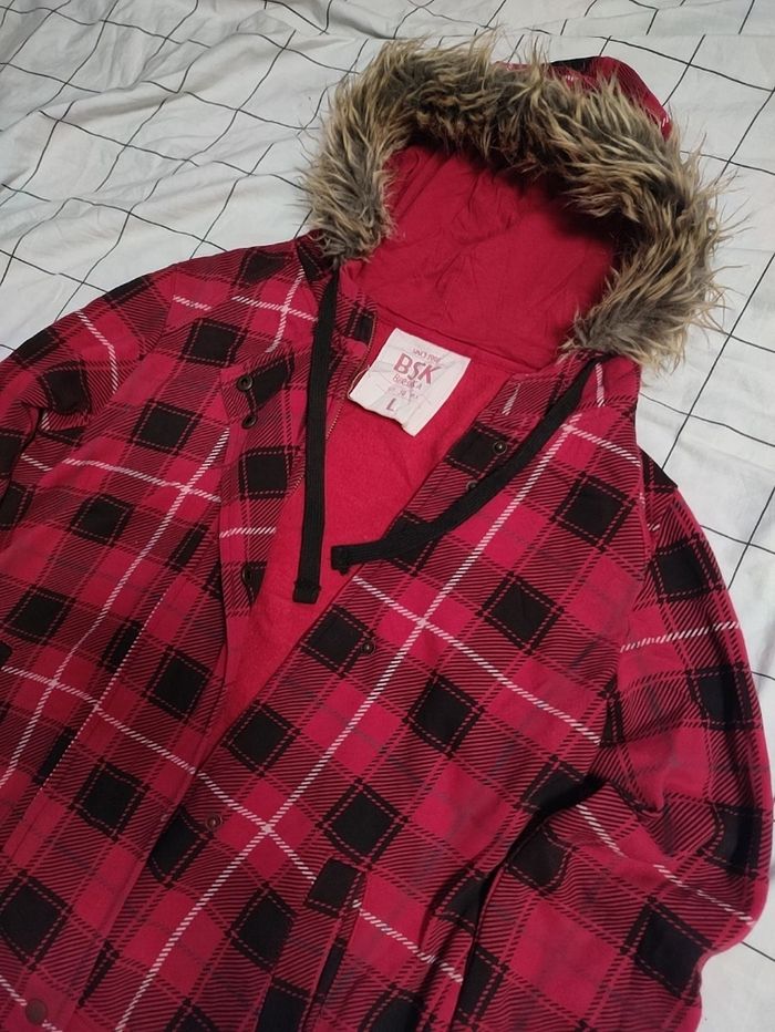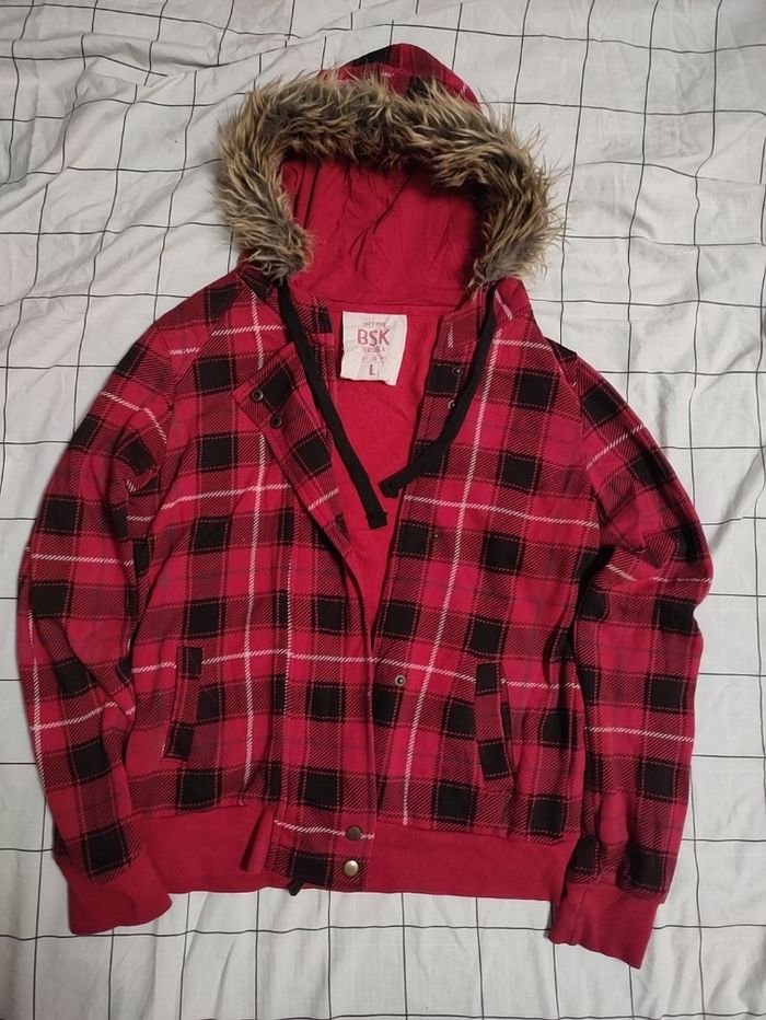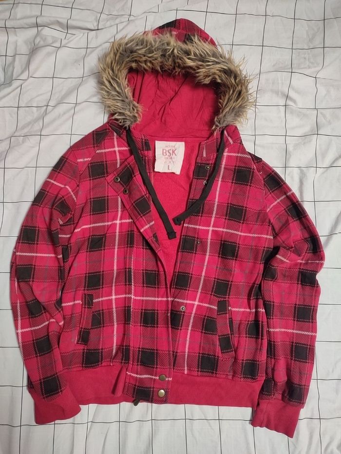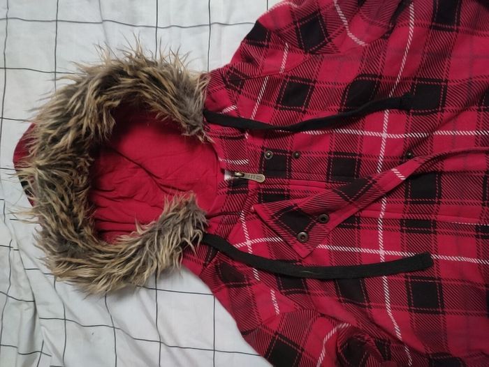 Vintage Y2K zip-up hoodie, red and black plaid, faux fur trim. 2000s style