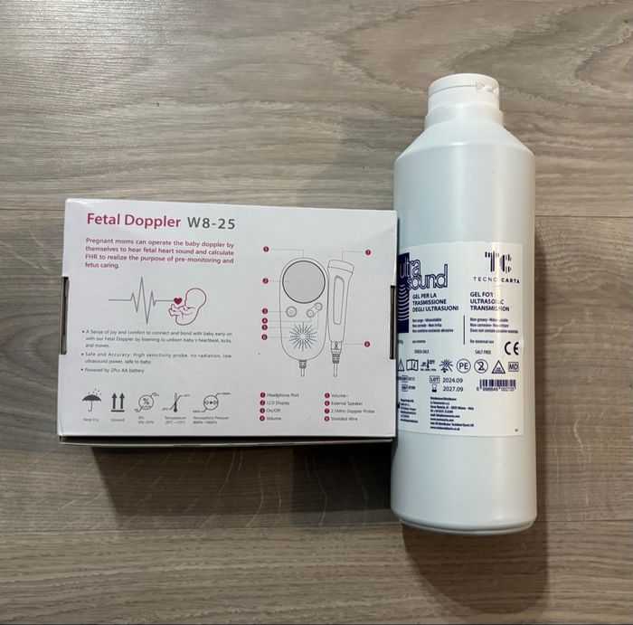 Très bon état avec piles fournis, et le gel, parfait pour écouter le cœur de bébé