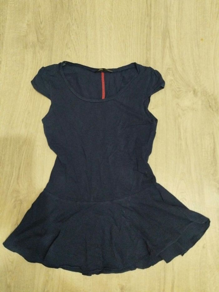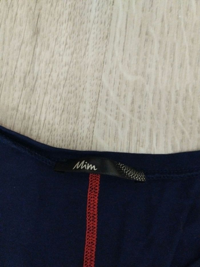 Top long moulant taille 36 Bleu marine avec une bande rouge dans le dos Couvre le ventre et les hanches Marque mim Porté 2 fois