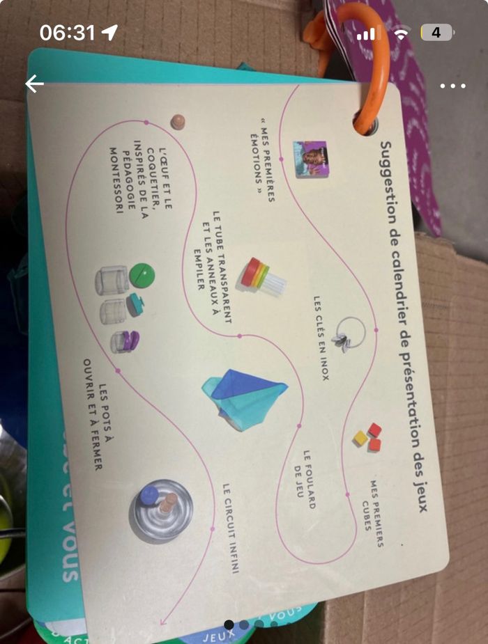 Kit Lovevery 7/8 mois Il manque l’œuf et le coquetier, le livre et la balle n’est pas celle d’origine