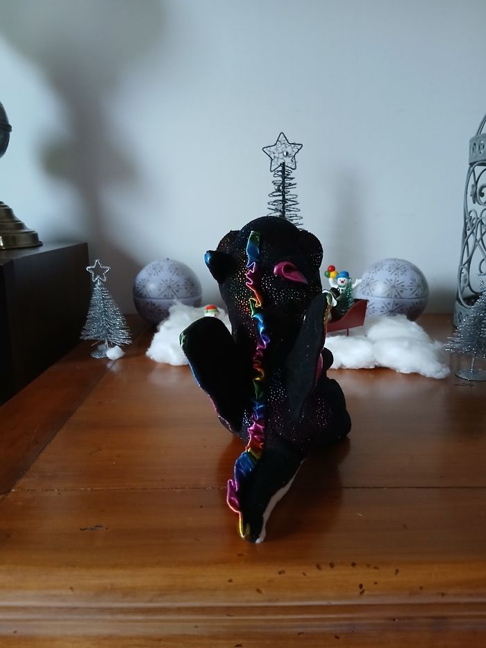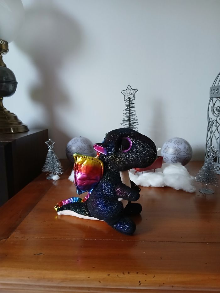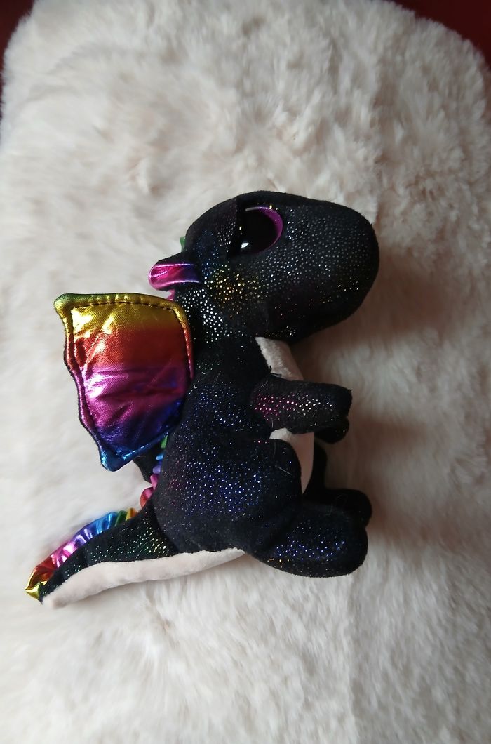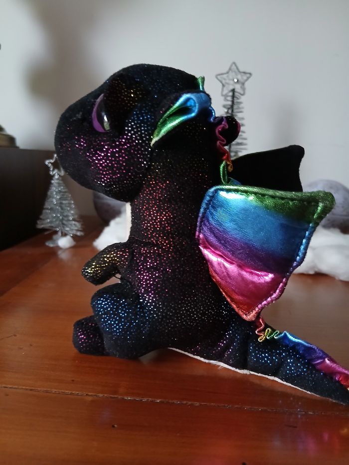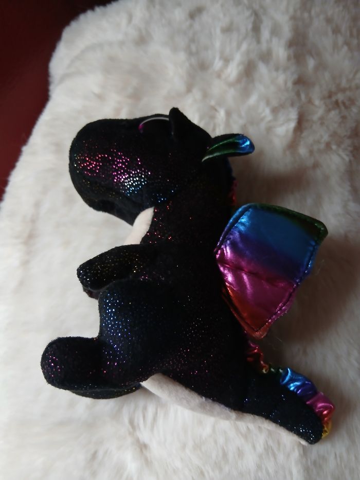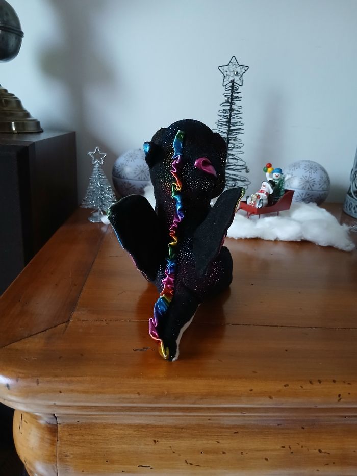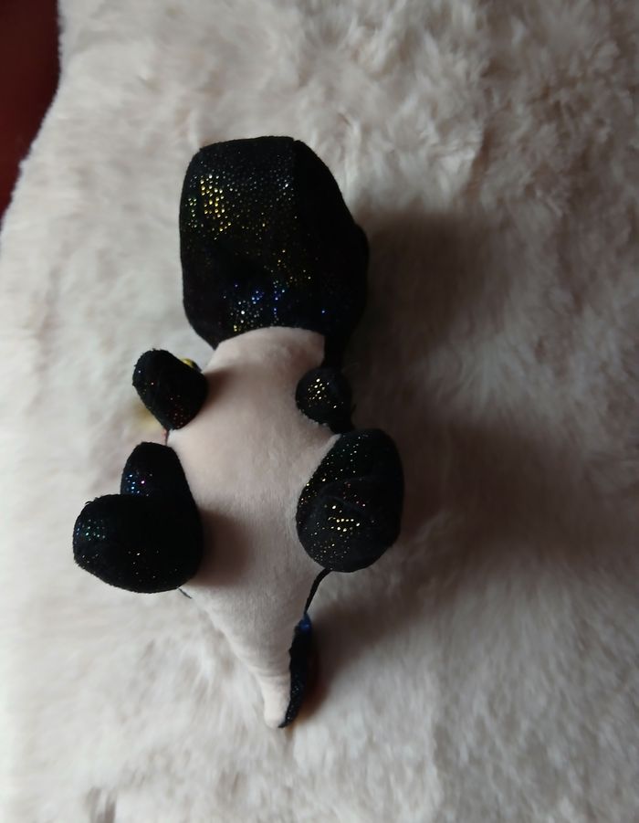 Doudou-Peluche entièrement rembourré; marque Ty. Yeux en plastique, semi recouverts par une paupière. Tissu pailleté sur une grande partie du corps; ventre uni, coloris beige, en tissu velouté. Petites billes en intérieur de la queue pour faciliter la position assise. Hauteur totale de 14 cm // voir photos pour détails
