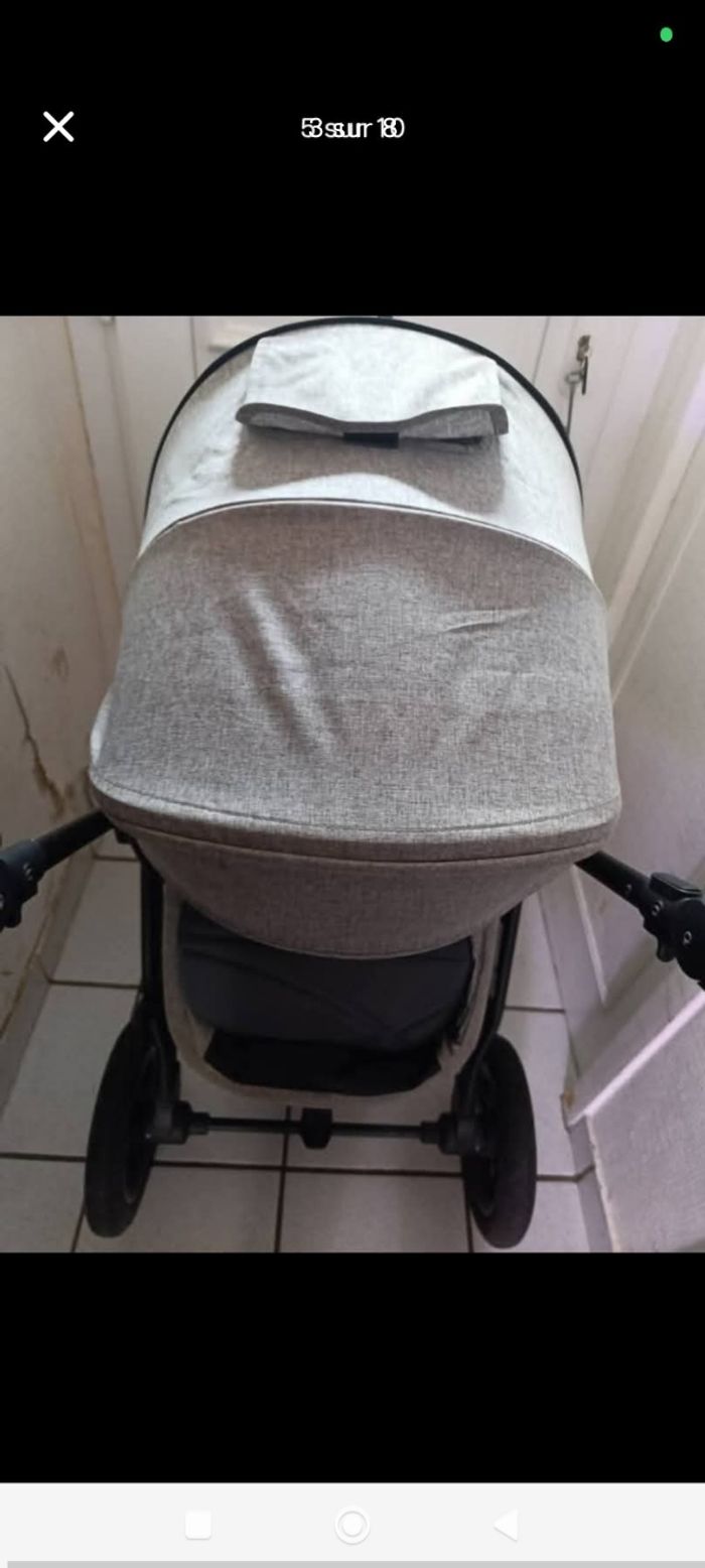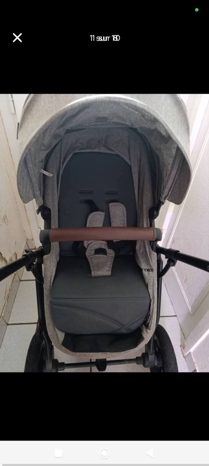 Poussette 3 en 1 couleur gris clair tout terrain on a causé une nacelle position assise habite pluie et moustiquaire. Comme sur la photo elle est juste abîmée au niveau du guidon il est en cuir il se change une très bonne poussette à venir chercher dans le (58) Nous sommes pas loin du Cher dans le 18 et le 03 Bon état