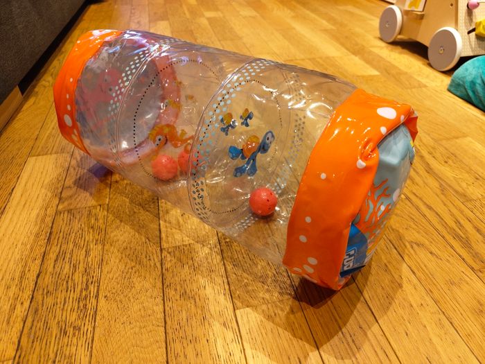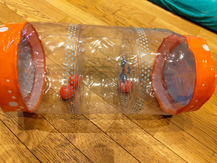 Cylindre gonflable transparent sur le thème marin, doté de balles sonores et conçu pour stimuler la motricité, la coordination et la curiosité des enfants dès 6 mois. Très bon état A permis à bébé d'appréhender la position genou et quatre pattes. Le cylindre fait aussi un bon instrument à bruit avec les balles