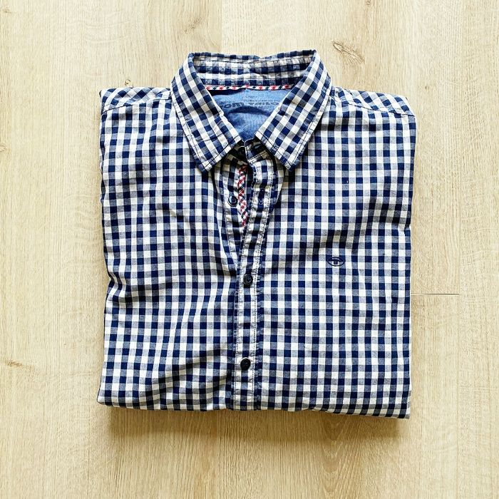 🏁 Chemise à carreaux inspirée du motif Vichy avec logo brodé pour Homme en très bon état et fabriquée en coton. ----- ⭐ Marque/Gamme : Tom Tailor 🎨 Coloris : Bleu et Blanc 📏 Taille/Mensurations : L ----- 📦 Envoi rapide et soigné 💡 Astuce : Jusqu'à -30% en achetant en lot !