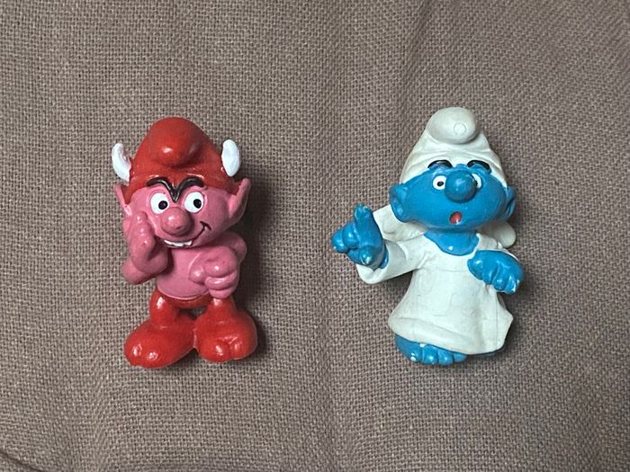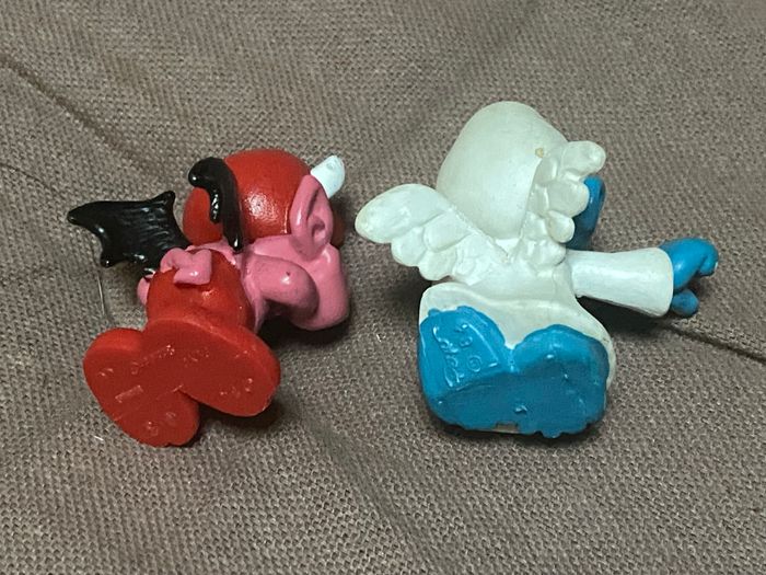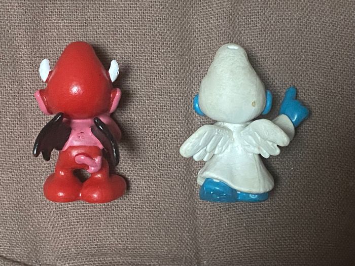 Figurines du schtroumpf ange 20212 et du schtroumpf démon, diable, diablotin, 20213, Schleich Telles que sur les photos. L'ange a un petit trou sur le chapeau (certainement un ancien porte-clés), visible sur la dernière photo. Puffo, puffi, pitufos, schlumpf, peyo, smurf, mi-ange mi-démon, bien et mal, smurfen