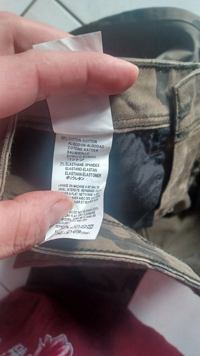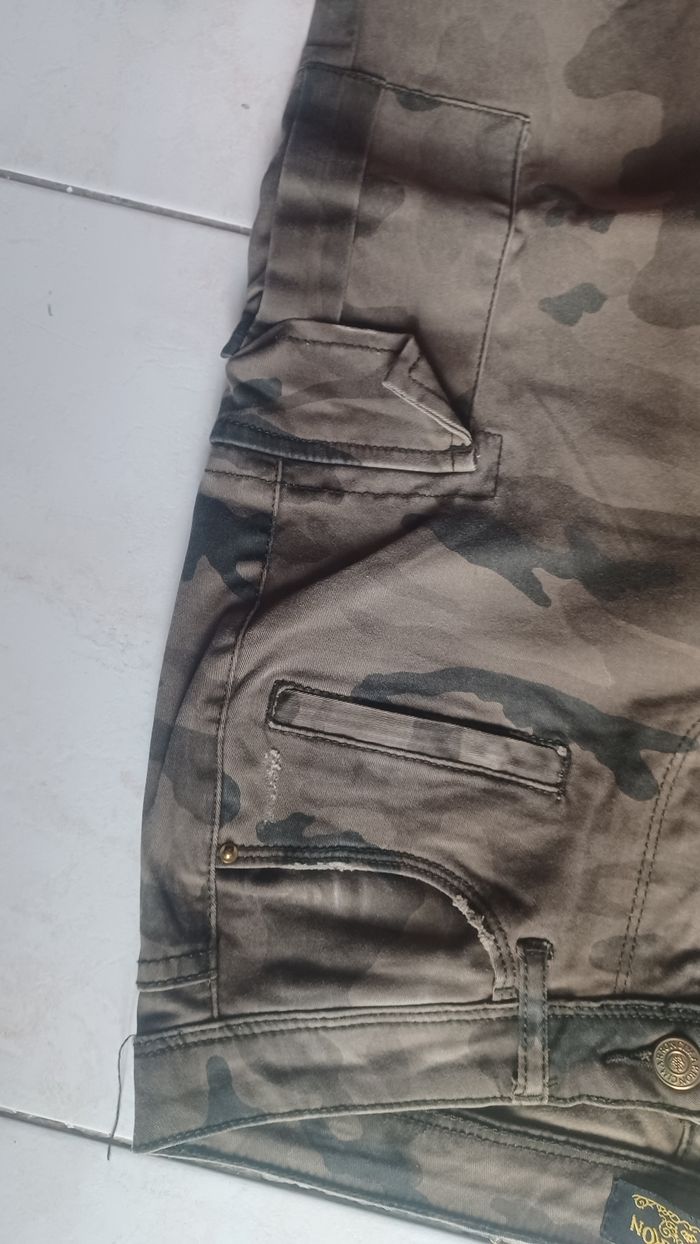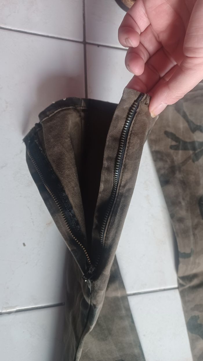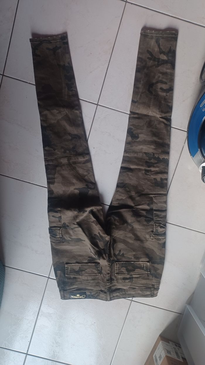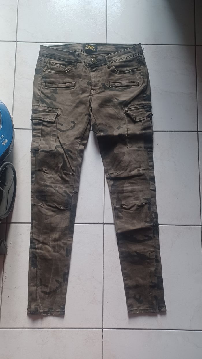 Jean femme 98% coton et 2% elasthane Couleur militaire poches sur les 2 côtés des cuisses 38et petite fermeture à la jambe en bas Très chic Bouton et fermeture