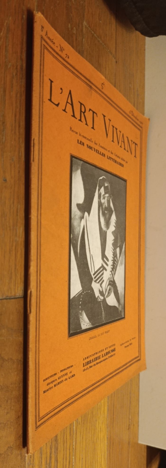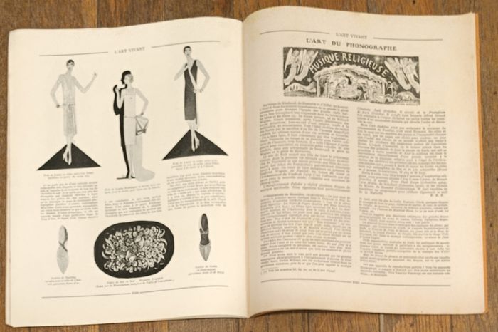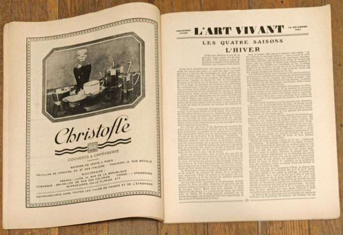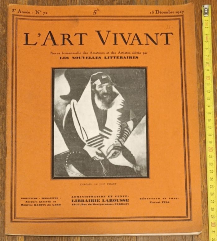 Rare Ancienne revue L'Art vivant 15 décembre 1927 N°72 3ème année Librairie Larousse Couverture Marc Chagall "Le juif priant" Quelques traces d'usure : - Tranche légèrement usée sur le haut - Légère tâche sur la couverture (au dessus du mot "Art" - Nombre "25" écrit au crayon sur la couverture - Trace de pliure sur la 1ère moitié du magazine Mais reste en assez bon état Cf photos Revue des Amateurs et des Artistes éditée par Les Nouvelles Littéraires Au sommaire de ce numéro : - Encart collé Les étrennes de l'Art vivant - Les arts décoratifs anciens : Les icones - La danse au music-hall : l'adage acrobatique - La nouvelle salle Pleyel - Portrait Marc Chagall - Un bureau moderne dans un appartement Louis XVI - Supplément à L'Art vivant : planche III - Un paysage Carthaginois - Mode : Miss Ruth Elder habillée par Jean Patou - L'art et la mode : tenue de soirée - L'art du phonographe - Les expositions - Nouvelles artistiques - Anciennes publicités : Christofle Boissier Galerie Granoff De nombreux anciens magazines et articles vintage disponibles, N'hésitez pas à regarder mes autres annonces