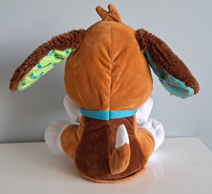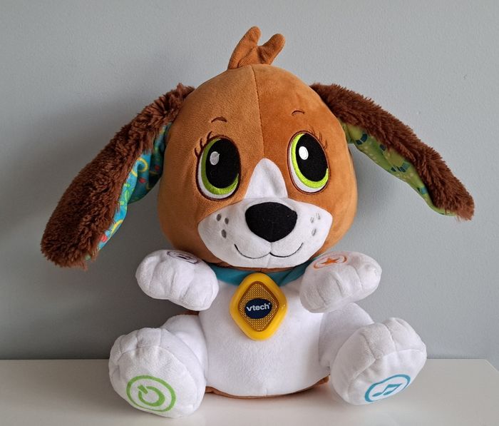 Peluche interactive Vtech "Toutou parle avec moi" 5 boutons sur les pates et le collier, plusieurs modes de jeu : répète ce que l'enfant dit, chante, discute et questionne, en bougeant ses oreilles. Dès 12 mois Fonctionne parfaitement (avec des piles), très propre.