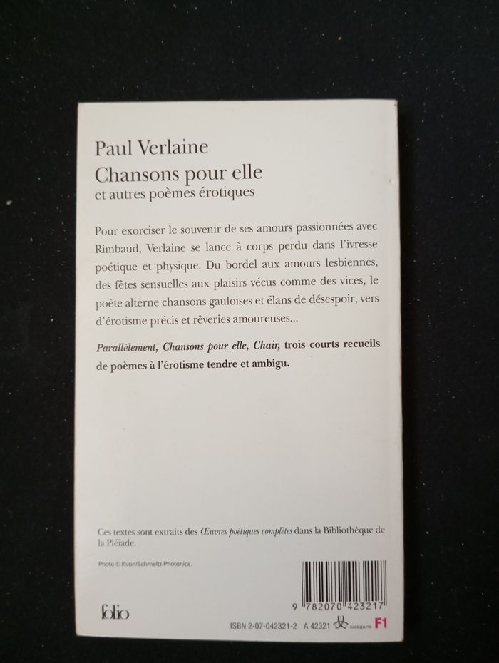 Je vends ce recueil de poèmes érotiques "Chansons pour elle" de Paul Verlaine. - Titre : Chansons pour elle - Auteur : Paul Verlaine - Genre : Poésie érotique - Éditeur : Folio - Année d'édition : Inconnue Bon état N'hésitez pas à me contacter pour plus d'informations !