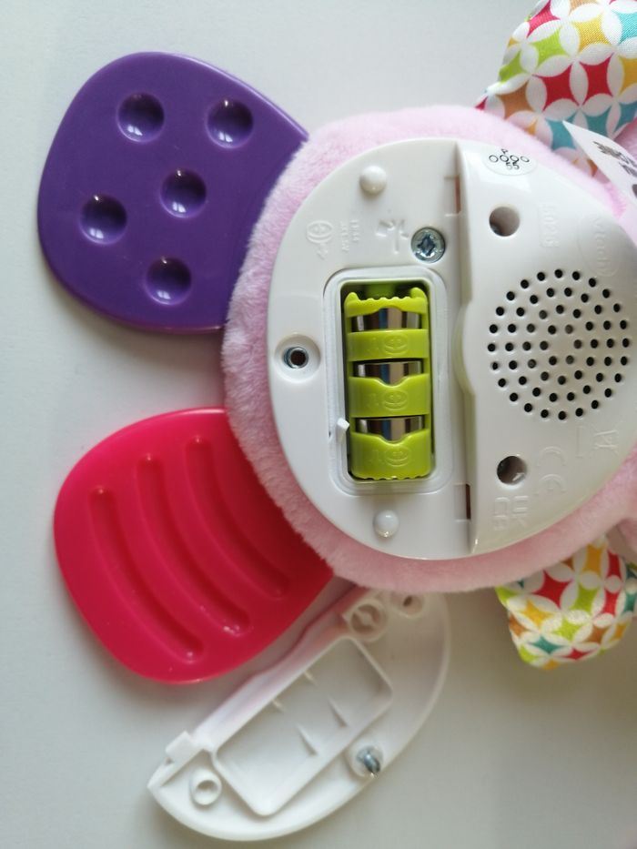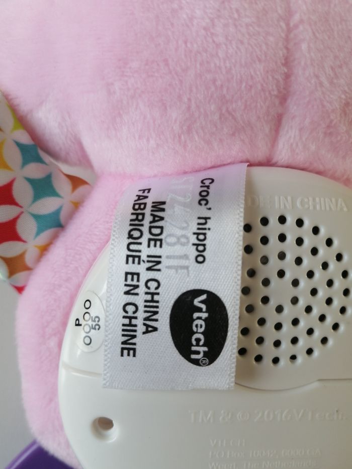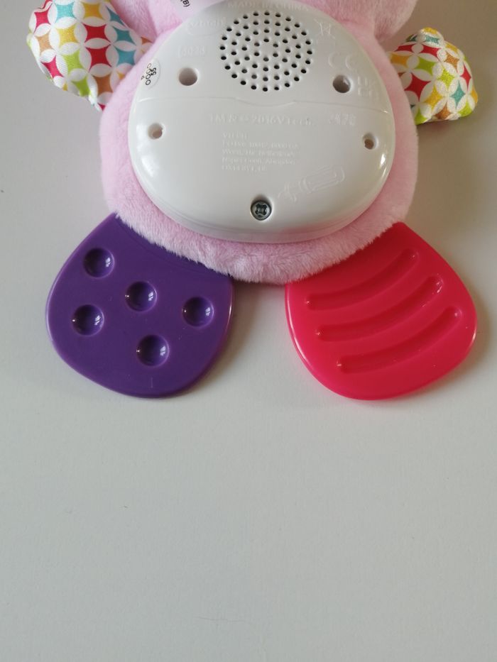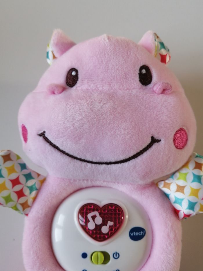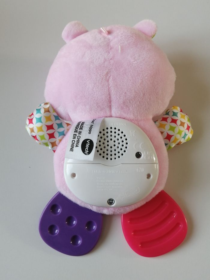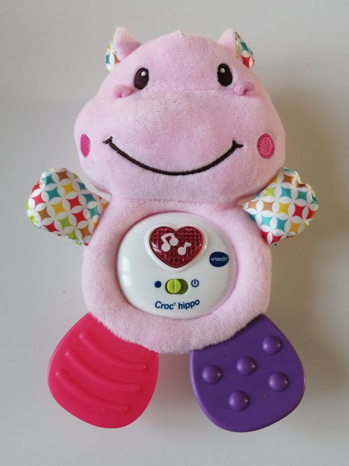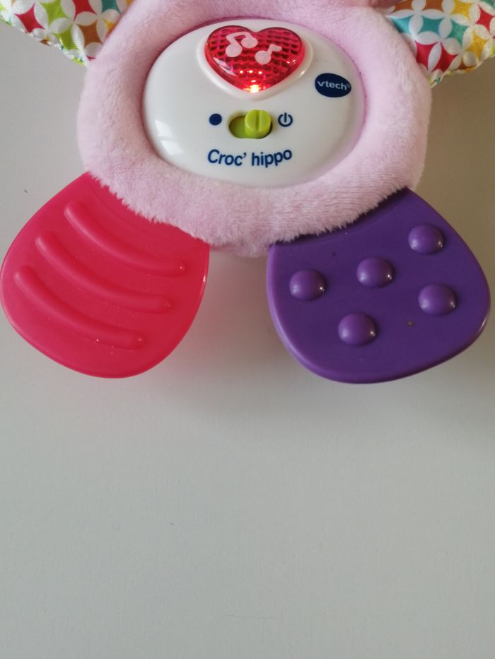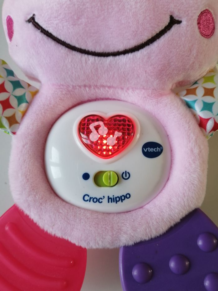 croc'hippo peluche jouet musical hochet avec anneaux de dentition mains crissantes au toucher fonctionne à piles qui sont fournies le petit cœur s'éclaire, plusieurs mélodies et chansons VTech baby 16 cm et dimension totale 20 cm