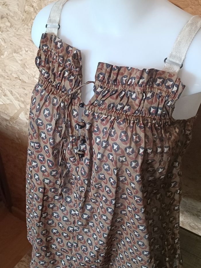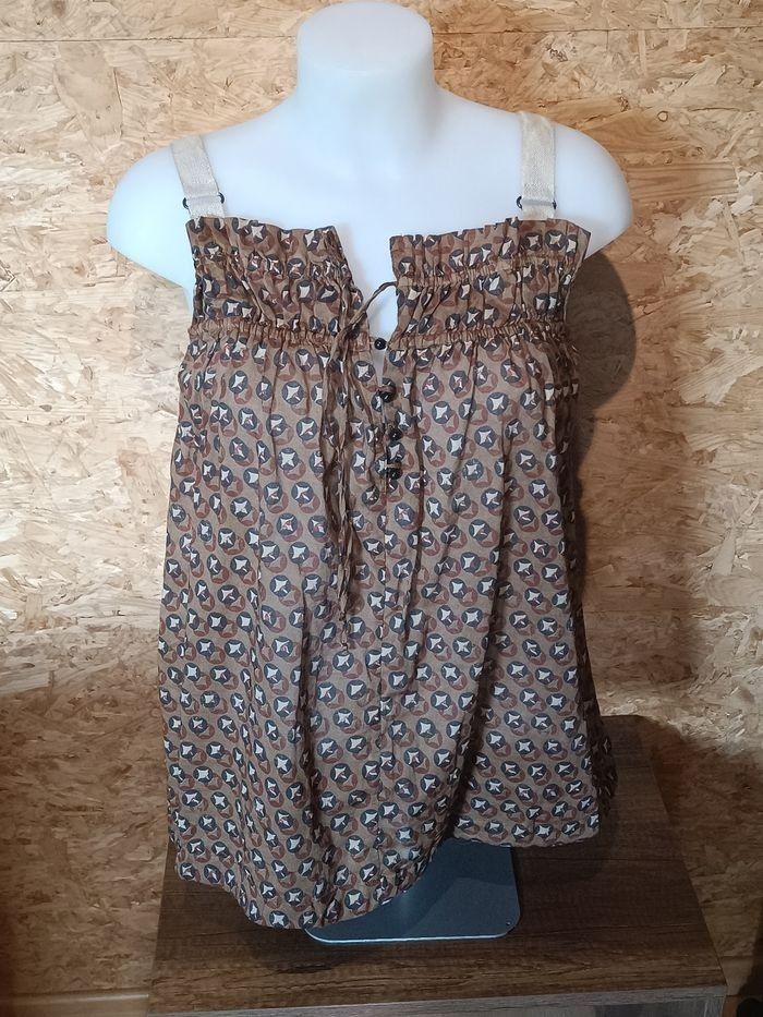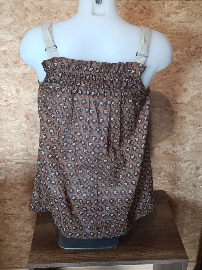 Blouse IKKS Resserré sur le dessus avec un élastique, matière très légère, décolleté avec des bouton et possibilité de resserré le bas de la blouse avec un système de cordon. Très bon état Taille 34